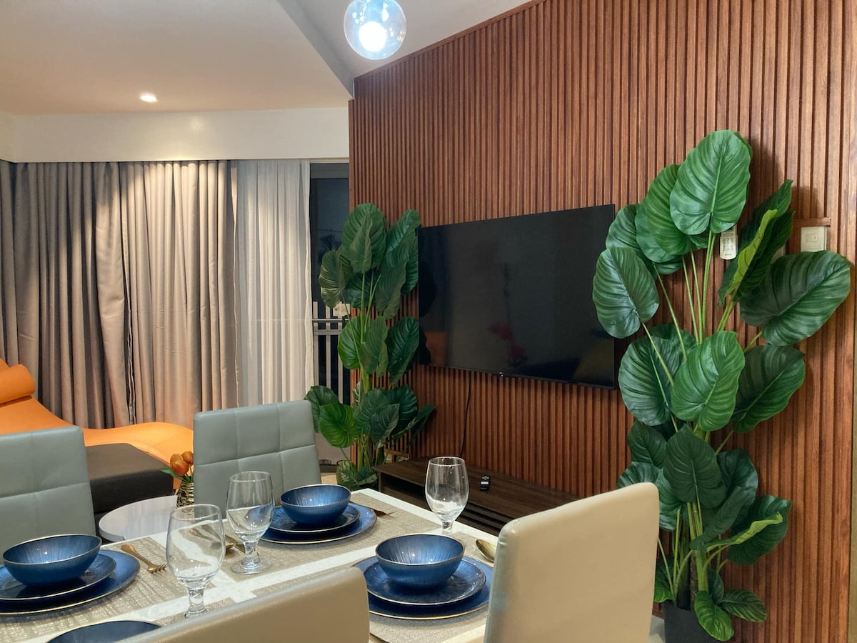 This comfortable and lovely 1BR Suite is your home away from home. Located on the high floor where you will find peace and tranquility, watching the sunrise and sunset in your own private patio. The patio has a view of the sea and lush greenery. All furnitures were meticulously picked and thoughtfully arranged to provide a homey feeling to all our guests. It is also equipped with high-speed internet, 55" smart TV in the living room, 43" in the bedroom and fully equipped kitchen.