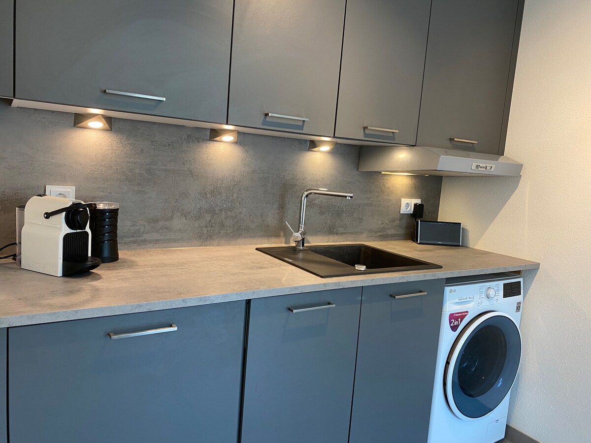Die Wohnung ist neu renoviert (2022) und modern eingerichtet. Neben einem eigenen Bad mit begehbarer Dusche gibt es eine kleine Küchennische inkl. Kühlschrank. Für Kaffee ist eine Kapselmaschine von Nespresso mit Milchaufschäumer vorhanden. Ein kleines Kochfeld ermöglicht die Zubereitung einfacher Speisen.