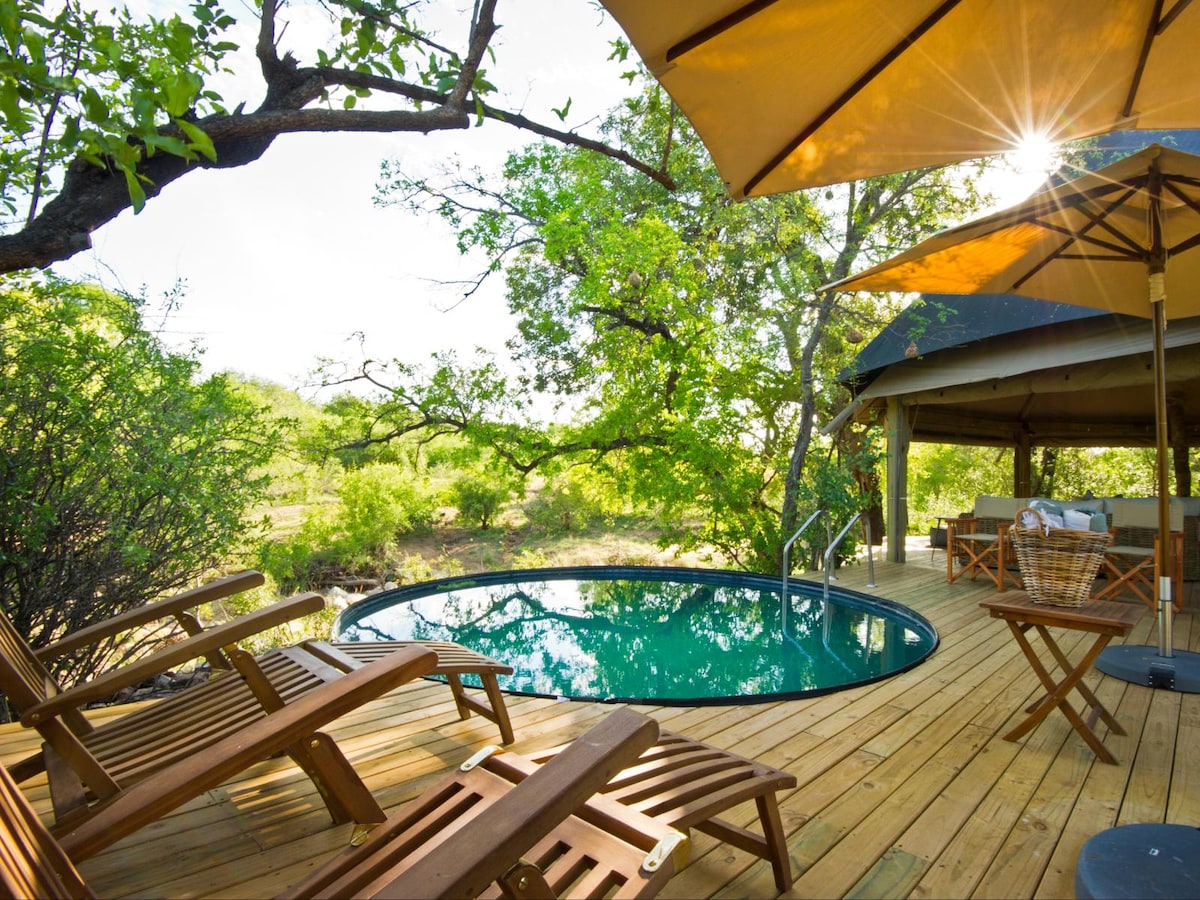 Accampamento di lusso con tenda nella boscaglia di Lowveld con splendide viste sulle montagne e fauna selvatica in libertà. Un'esperienza davvero unica in cui i nostri ospiti ricevono un'autentica esperienza nella boscaglia, senza confini tra loro e gli animali naturali e l'avifauna. Siediti sulla terrazza con una tazza di caffè mentre una giraffa si aggira tranquillamente accanto a te. Un'opportunità per rilassarsi, ricaricarsi e riconnettersi con la natura e con se stessi.