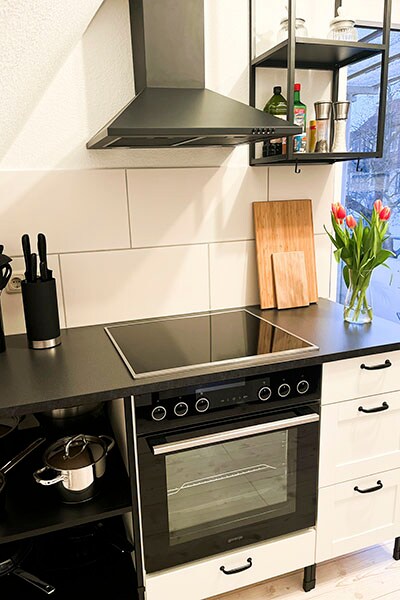 Abitare il lusso tra le antiche mura dell'ex casa del guardiaboschi di Riddagshausen: La sera, sedetevi comodamente sulla pelle di pecora in uno degli ampi davanzali con vista sul giardino simile a un parco della "Stadt-Land-Scheune". Godetevi la luce tremolante del camino a gas o cucinate con gli amici sull'isola di cottura. Lasciatevi incantare dall'altezza del soffitto e dall'imponente capriata. Doccia giapponese. Materassi e cuscini a buffet di Tempur per dormire come sulle nuvole.