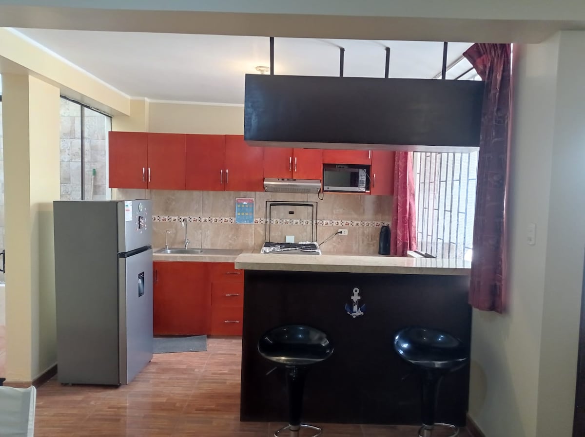 Relájate con toda la familia en este tranquilo lugar para quedarse. Estamos a unas cuadras del mercado, comisaria y banco bcp. Tambien a 5 minutos del malecon costero, plaza vea, playa, discotecas y restaurantes. Contamos con el departamento totalmente amoblado de estreno *Cocina: frigider, microondas , cocina, licuadora, olla arrocera, etc. *Sala: juego de comedor, muebles de sala, tv smart ventilador, centro de entretenimiento. *Baño: agua caliente, papel, jabon, toallas Se cuenta con wifi