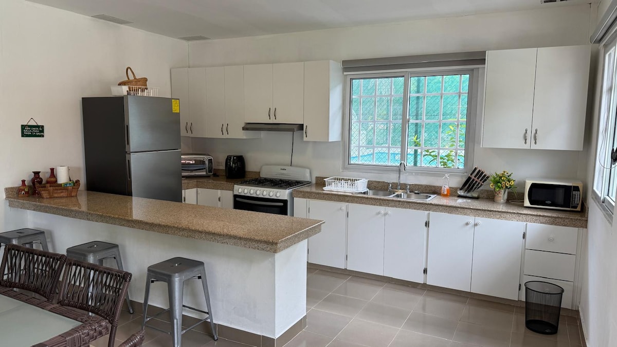 Escucha las olas desde la privacidad de nuestra terraza y crea recuerdos inolvidables en este alojamiento único y familiar a pocos paso de la playa con piscina privada. El palmar es una comunidad tranquila con varios restaurantes disponibles a unos pasos de la casa. La propiedad esta totalmente cercada para la tranquilidad y seguridad de hijos y sus mascotas adicional tienes wifi, TV cable en ambas habitaciones y aires acondicionados en la sala comedor y en todas las recamaras