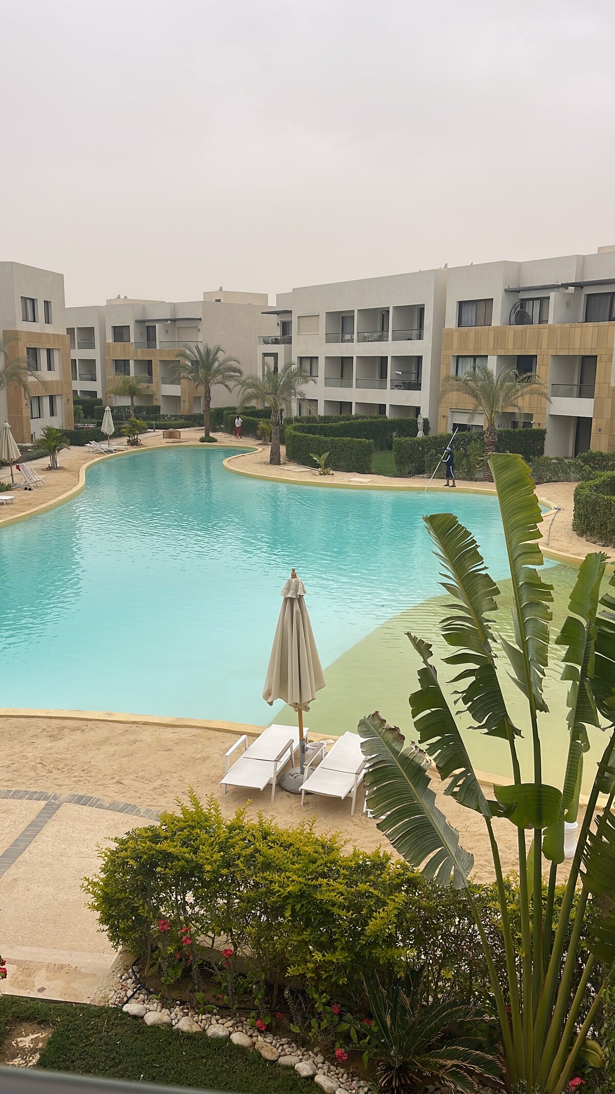 Moderno appartamento con 2 camere da letto all'interno dell'Elite Tulip Hotel, Ain Sokhna. Dotato di cucina, wifi, aria condizionata e vista tranquilla sul retro. Può ospitare fino a 4 persone. Accesso gratuito a spiaggia privata di sabbia, piscine e hall dell'hotel. Servizi a pagamento: ristoranti, lavanderia e palestra. Luogo ideale per rilassarsi al mare con i comfort di casa e i vantaggi di un resort.