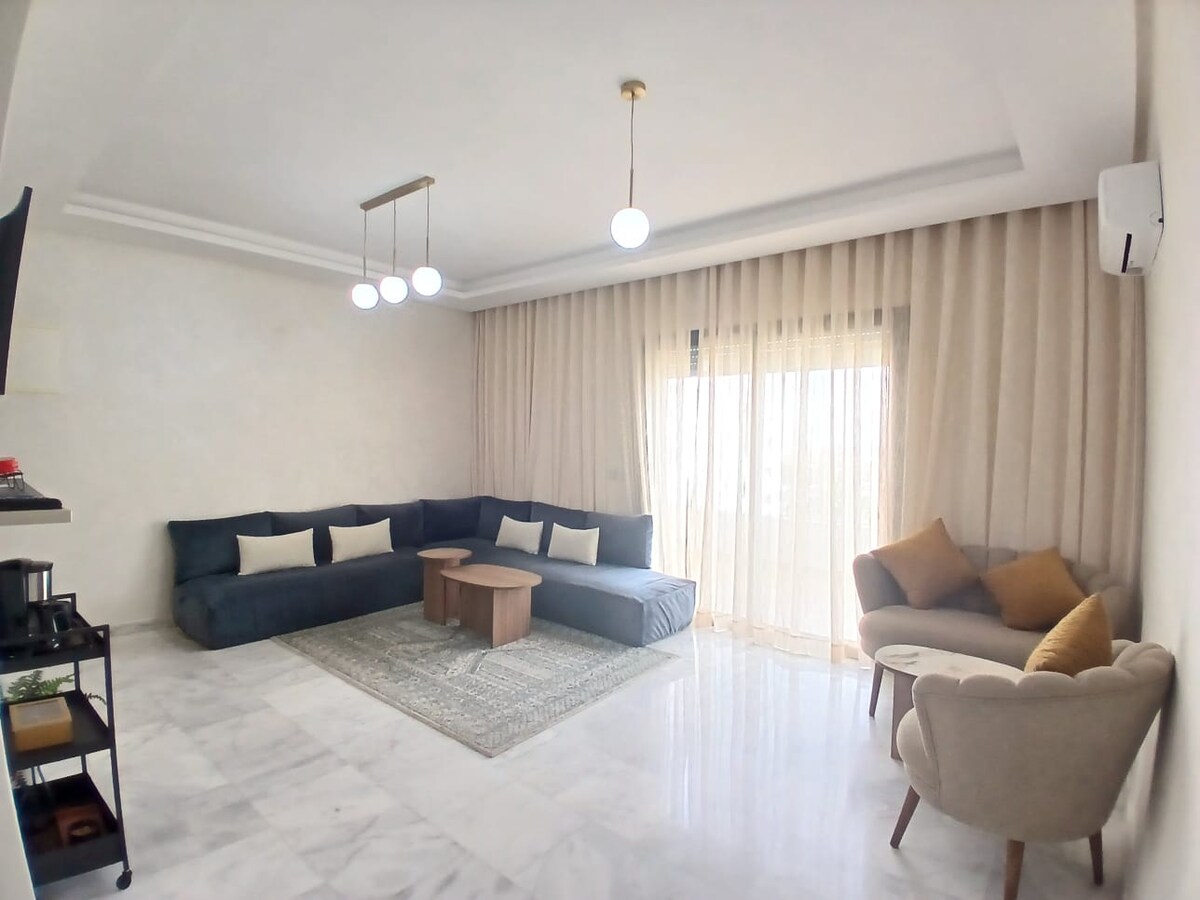 Moderno appartamento con 3 camere da letto a Zenata Eco-City, con luminoso soggiorno, cucina attrezzata, 3 bagni e 2 ampie terrazze con vista mozzafiato sulla piscina e sul mare. Residenza tranquilla e sicura, vicino alla spiaggia e ai servizi. Ideale per famiglie o gruppi, fino a 6 persone. Wi-Fi, aria condizionata e parcheggio privato inclusi. Godetevi un ambiente tranquillo e di alta qualità.