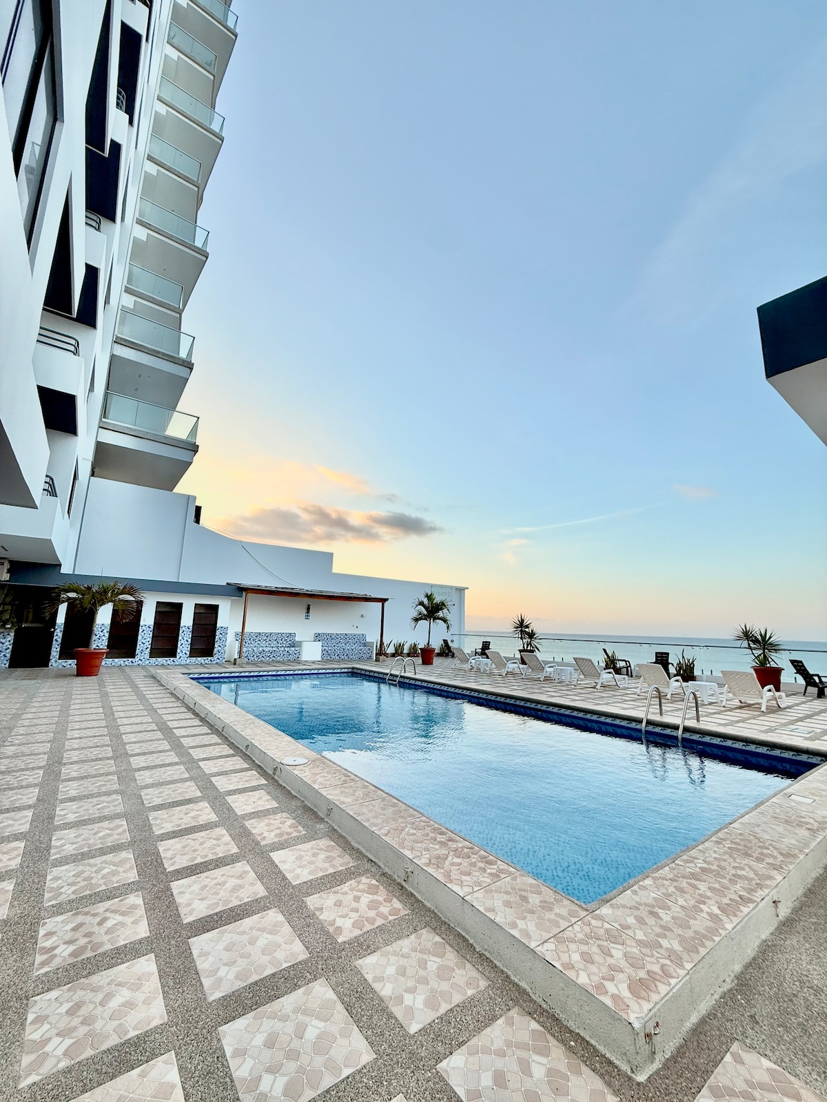Appartamento nel centro di Manta con vista mare. Situato sulla prima linea del mare con accesso diretto alla spiaggia di El Murciélago, a pochi metri a piedi dal lungomare panoramico, dai ristoranti, dal Pacific Mall e dai supermercati; dispone di generatore di corrente, piscina riscaldata, vasca idromassaggio, palestra, parcheggio, ascensore e area ricreativa per bambini, l'edificio è totalmente sicuro e le sue strutture sono adatte per una vacanza con la famiglia, il partner o gli amici.