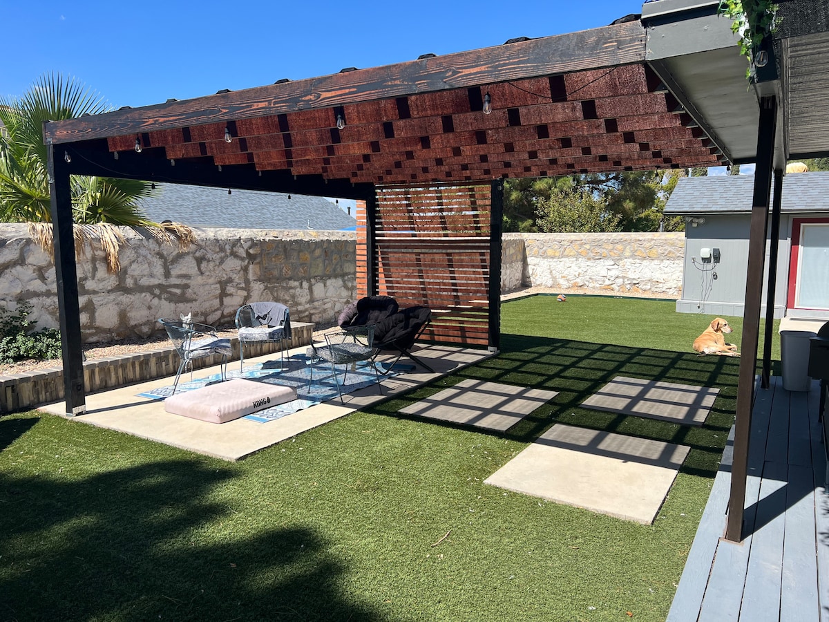 Scopri la vivace cultura messicano-americana e la sua calorosa ospitalità in questa casa ristrutturata a pianta aperta. Che tu sia in città per lavorare, rilassarti o giocare, questa spaziosa casa con 3 camere da letto, 2 bagni, sala giochi, oltre 500 Mbps, aria condizionata refrigerata, suite king e cucina gourmet ha tutto. Rilassati vicino al tavolo da fuoco o al pergolato con amaca nel NUOVO rifugio in giardino con campo da basket e pickleball! Vicino a I-10, aeroporto, UTEP/UMC/centro città/FtBliss/HuecoTanks/ristoranti/parchi/negozi. Non vediamo l'ora di darti il benvenuto. ¡Bienvenidos!