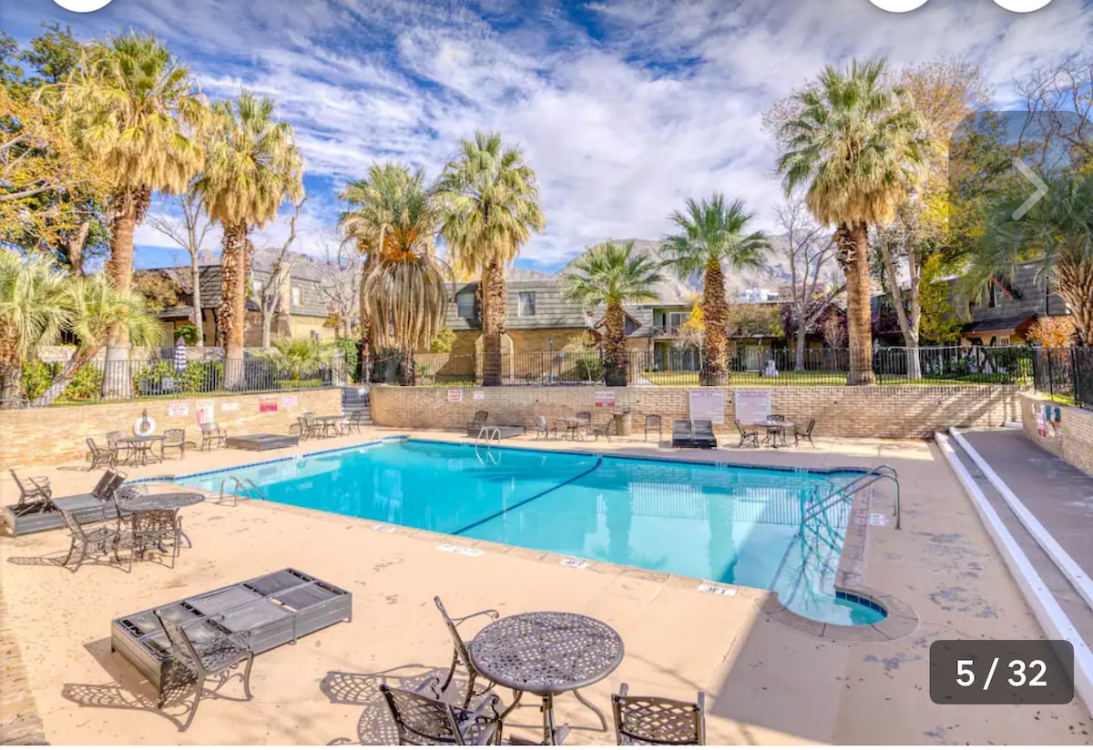 Experience comfort in this recently renovated condo boasting Refrigerated A/C, 2 queen beds, 2 full baths, high-speed internet, a workspace with a monitor, living room with a Smart TV, Washer/Dryer, a fully stocked kitchen, covered parking, and a balcony with Mountain Views. Enjoy a gated pool and grill area available from mid-May to Sep 4th (Closed on Mon for maint). Centrally situated near UTEP, Las Palmas & Providence Hospitals, Downtown, Baseball Stadium, Restaurants, Nightlife, and I-10.