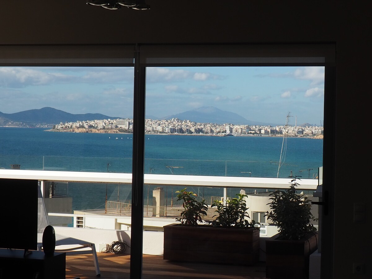 Fully renovated apartment in Alimos, Athens, Greece. A stunning, cosy, rooftop apartment, with a vast private terrace, offering instaworthy views of the Athenian Riviera. Interiors tastefully and minimally designed, speck clean, fully and luxuriously equipped for short or long stays, winter or summer. Enjoy your holiday, easily blending moments by the beach (2 min walk) and the Athens Center with its great history and atmosphere.