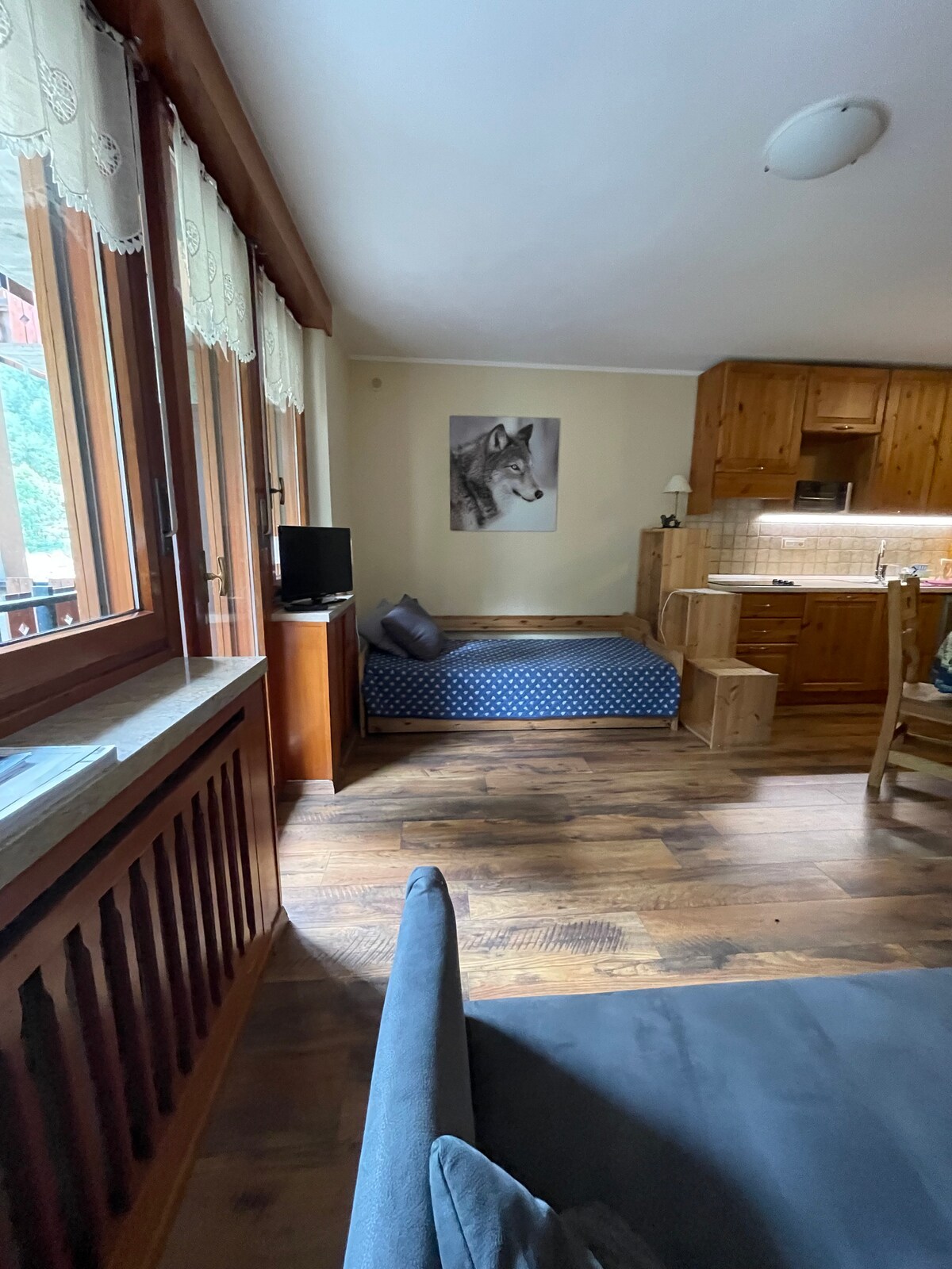 L'Atelier: appartamento in stile tipico montano, ristrutturazione Dell'atelier di falegnameria del nostro Papa', dove trascorreva le sue giornate lavorative immerso nel profumo del legno. Situato al piano terreno della casa di famiglia del 1800. L'appartamento accoglie 4 persone con 2 camere matrimoniali e due bagni, può ospitarne altre due nel divano letto matrimoniale del soggiorno. Spaziosa zona giorno con lato cottura, pranzo e soggiorno. Lettino aggiunto per bambini su richiesta.