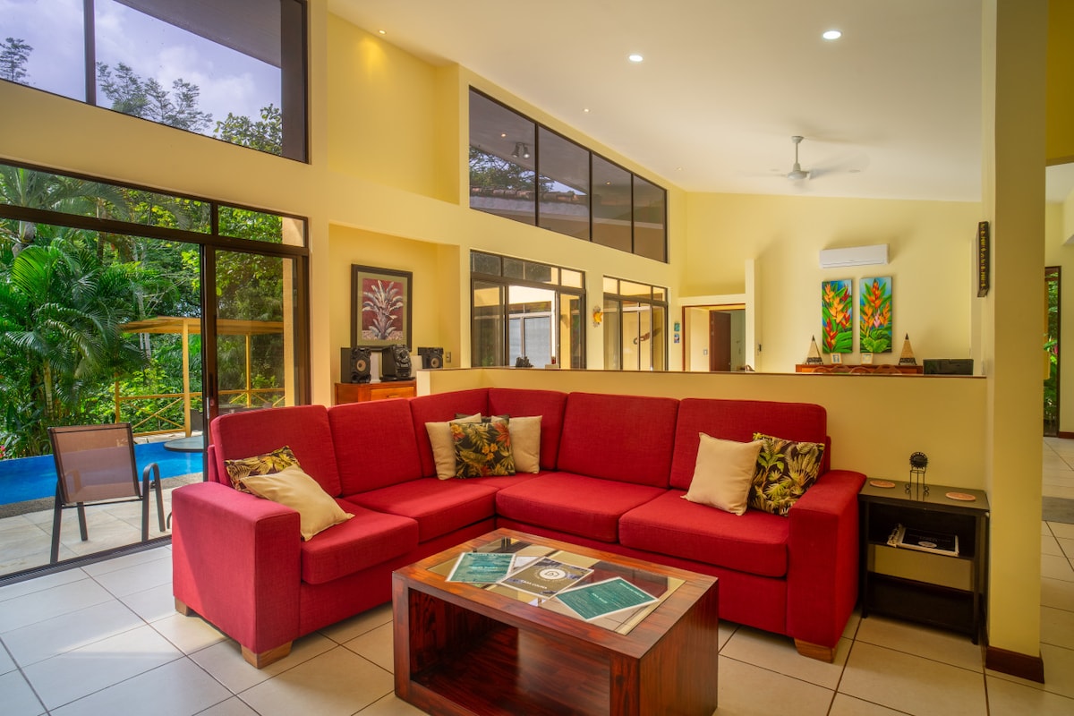 Casa sull'albero unica di ispirazione balinese che si affaccia su un fiume stagionale, sul giardino delle farfalle e sul frutteto tropicale. Costruito con legname di provenienza locale che è stato per lo più fresato nella proprietà e completato con ricordi e accenti in legno intagliati raccolti mentre esploravano l'Indonesia e la Thailandia. Questo è un paradiso per gli amanti degli uccelli, con visite quotidiane di are scarlatte, pappagalli e tucani. Situato a breve distanza in auto dal surf di livello mondiale, dai ristoranti sull'oceano e dalla vita notturna di Playa Hermosa e Playa Jaco.