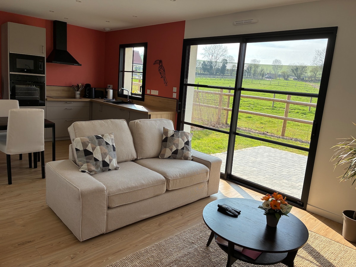 Biancheria da bagno e da letto non fornita (supplemento 15€) Monolocale nella valle della corsa vicino a montreuil sur mer e ai suoi bastioni Appartamento al 1 ° piano con ingresso indipendente, terrazza in legno di 18 m2 esposta a sud con sdraio e salotto in giardino. Uno spazio camera con un letto per 2 persone (140x200), una zona salotto, una sala da pranzo e un angolo cottura con forno a microonde, frigorifero e piano cottura. Bagno indipendente con cabina doccia 120x80, lavabo e wc.
