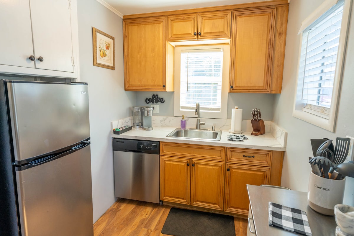 *Posizione centrale - A pochi passi da Vernon Street * 2 camere - 1 letto a due piazze con comò, toeletta e sedia da lettura, divano letto singolo estraibile. - 1 letto singolo con letto estraibile e piccolo comò *Cucina rifornita - Incluso un Keurig e un forno per buongustai *Accogliente salotto - Opzioni intelligenti sulla TV a schermo piatto - Copri divani lavabili *Attività divertenti - Giochi da tavolo, puzzle e libri - Ferro di cavallo, buca del mais e palla da bocce *Spazio di lavoro - Scrivania, computer Mac *Lavanderia *Zona pranzo privata all'aperto