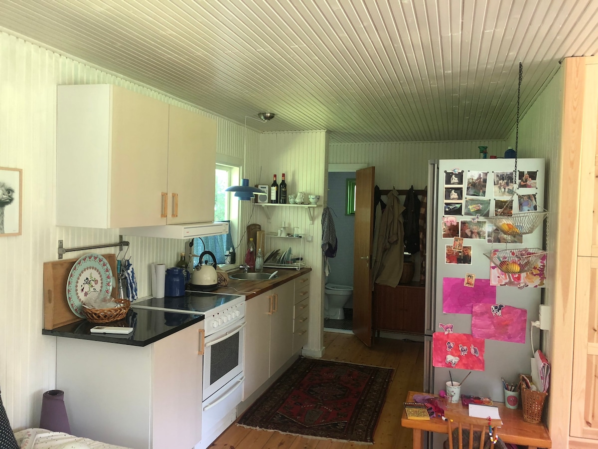 Cottage immerso nel verde con veranda e vista sul giardino. Piano superiore con lucernario e vista su tiglio, ciliegio e sull'ampio paesaggio. Per viaggiatori singoli, coppie e famiglie, questo alloggio tranquillo ed elegante è adatto. I bambini hanno la possibilità di giocare in modo fantasioso nell'ampio giardino con trampolino e barca vecchia. Piano superiore con camera da letto con un letto matrimoniale 200cmx200cm e una camera per bambini con 2 letti 200x80 e 170 x 70
