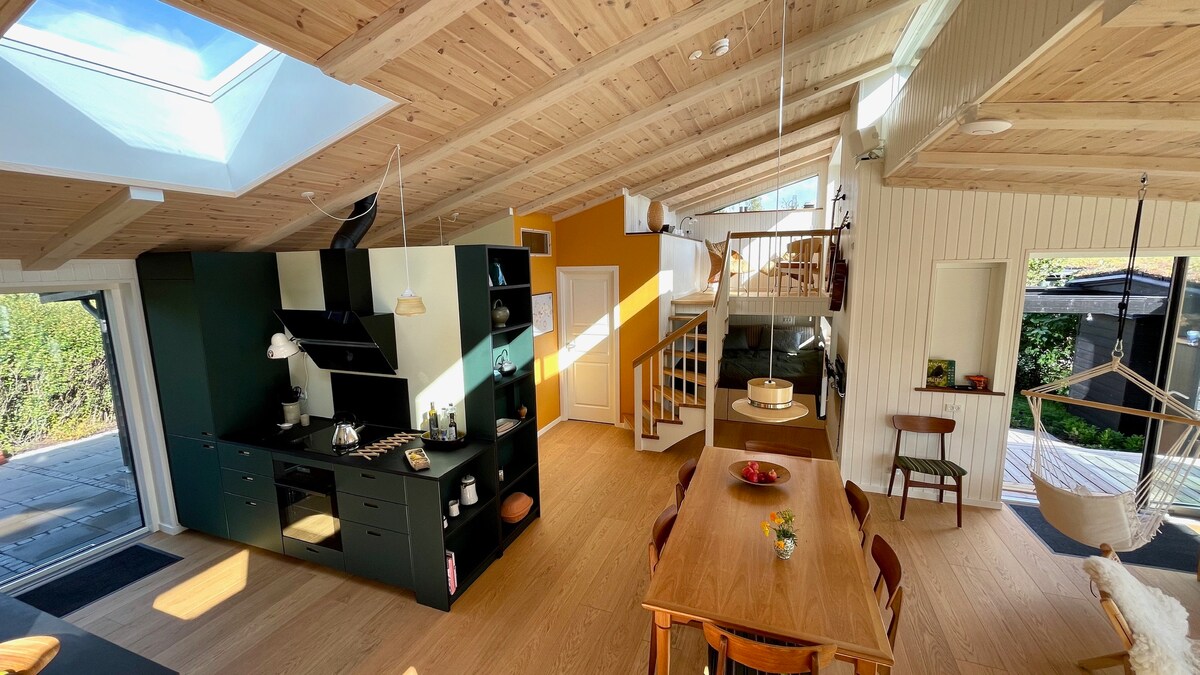 Rilassatevi in una casa estiva unica, ben attrezzata e accessibile ai disabili, con soffitti alti, angoli insoliti e stanze con una luce fantastica. Goditi la tranquillità, la natura e i suoni del mare a portata di mano. Esplora la grande terrazza con angoli accoglienti, i cervi in visita e l'accesso diretto alla spiaggia sabbiosa a 100 m dalla casa. Osservate il sole e il cielo scuro "Dark Sky" attraverso il telescopio e il cannocchiale della casa. Utilizza gli strumenti musicali e l'impianto audio o fai un giro in acqua con la canoa, due kayak da mare o tre tavole da paddle (SUP).