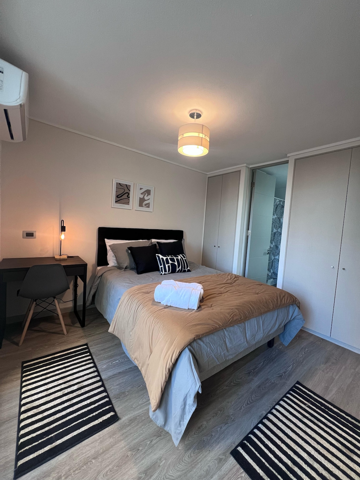 Moderno appartamento con parcheggio opzionale, completamente attrezzato, a 3 minuti dalla Movistar Arena, a 4 da Fantasilandia e a pochi passi dalla metropolitana Rondizzoni, dal Parco O'Higgins e dalla sua piscina. A 12 minuti dall'OUTLET Buenaventura a Quilicura Ideale per 4 adulti e 2 bambini Dispone di letto, divano letto, aria condizionata, cucina completamente attrezzata, WiFi e biancheria da letto. Vista a nord, ideale per apprezzare i fuochi d'artificio dalla Torre Entel dal balcone del 6° piano o dal tetto. Vasca idromassaggio in manutenzione