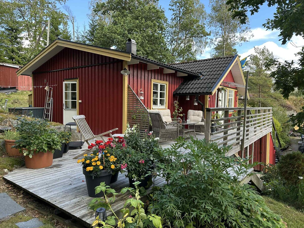 Nyrenoverad stuga med sängplatser för 6 personer. Två sovrum med våningssängar samt ett sovrum med dubbelsäng. Stugan ligger intill en sjö och detta är den enda stugan som finns intill sjön vilket gör att läget är helt ostört och fridfullt! Brygga med badstege finns. Trots sitt lugna och fridfulla läge är det inte mer än ca 10 minuter till livsmedelsaffär och 25 minuter till köpcentrum. Svamp- och bärplock finns runt knuten! Plasteka och åror finns att låna.