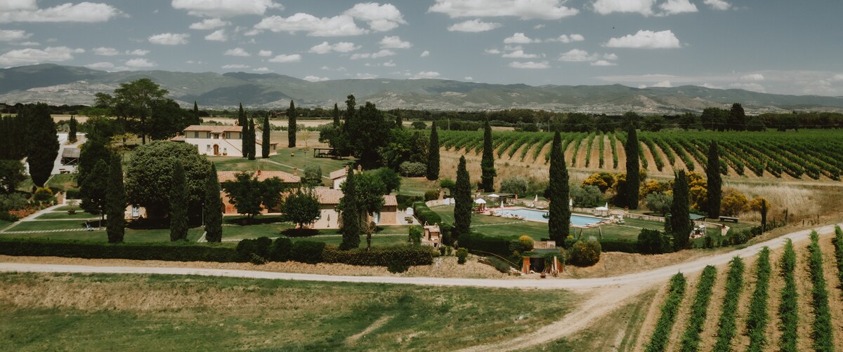 Siamo una piccola azienda agricola con agriturismo a conduzione familiare al confine tra Toscana e Umbria. L'antico casolare nel quale viviamo con i nostri figli è circondati da vigneti e oliveti con una splendida vista su Montepulciano. Vi possiamo ospitare in 2 appartamenti e/o in 1 camera indipendente arredati con mobili di arte povera e originalità. Nel grande giardino, a disposizione di tutti, ci sono due piscine (una per bambini), giochi, l'orto biologico, e il piccolo "ristorante".