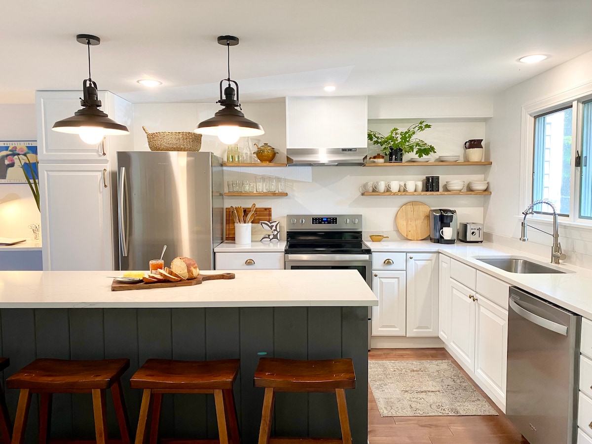Affitta l'intera casa. Ampia camera da letto principale con bagno privato e 2 camere da letto che ospitano 4 persone con un bagno completo in comune, una camera bonus con divano letto. Cucina rinnovata, stufa a propano (sembra una stufa a legna), portico coperto, sala fitness, giochi, cucina completamente attrezzata, vasca idromassaggio (disponibile dal Memorial Day al Ringraziamento), focolare all'aperto, il tutto su 8 acri. Situato in posizione centrale rispetto a tre stazioni sciistiche, mountain bike, escursionismo, kayak, nuoto e molto altro. Una casa invitante in ogni stagione!