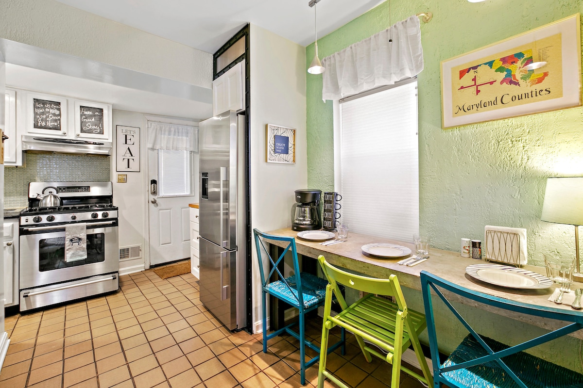 A pochi passi dall'Inner Harbor di Baltimora, da Fells Point, da Little Italy e dal John's Hopkins Hospital, questo appartamento con una camera da letto completamente attrezzato offre tutto il necessario! Questa unità moderna e contemporanea all'interno di una delle case a schiera storiche di Baltimora (costruita nel 1850) presenta soffitti alti e splendide finestre a tutta altezza. L'appartamento include una cucina completa, un bagno completo, una camera da letto con zona ufficio, un soggiorno con TV HD e divano letto e una lavatrice/asciugatrice. È disponibile anche una bicicletta!