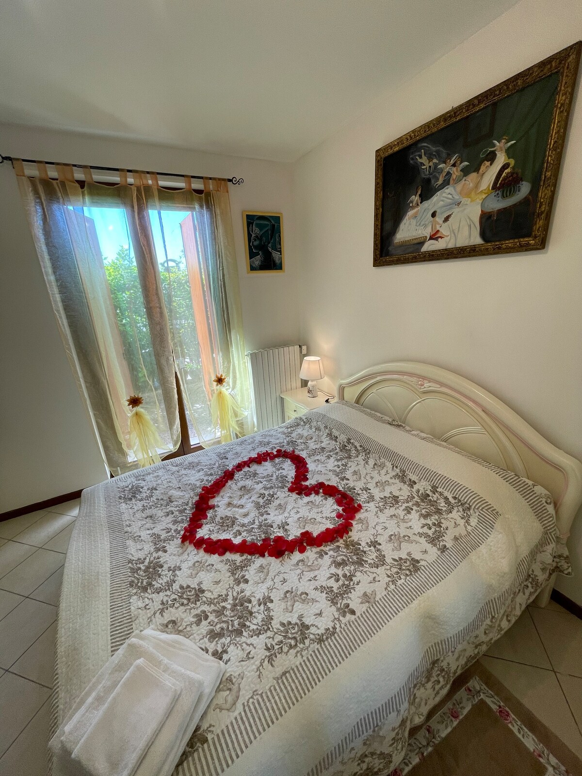 Rilassati con tutta la famiglia in questo alloggio tranquillo. L'appartamento ideale per 2 persone adulte o 4 persone (se ci sono due ragazzi che dormono sul divano letto in sala) dove potersi rilassare, e vivere l'esperienza del Lago di Garda che è a 10 minuti o di Verona a 15 minuti. Siamo a pochi metri dalla piscina Comunale, dai campi da tennis e dai parchetti per i bambini. A 800 metri dal centro di Bussolengo (VR). Siamo a piano terra con giardino e porticato con salottino esterno.