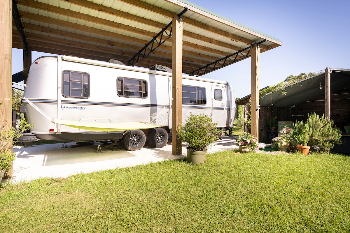 A wonderful Glamping experience, the Silver Bullet vintage Airstream camper sits on our lovely organic blueberry and horse farm, surrounded by nature and wildlife – yet close to recreation and attractions. Guests love the farm’s peace and quiet and proximity to Fairhope, beaches, and more. Bikes, kayaks, and unexpected amenities await you! You’ll love meeting farm critters, picking blueberries and herbs, playing games, gazing at stars, and enjoying a guest favorite – the amazing outdoor space.