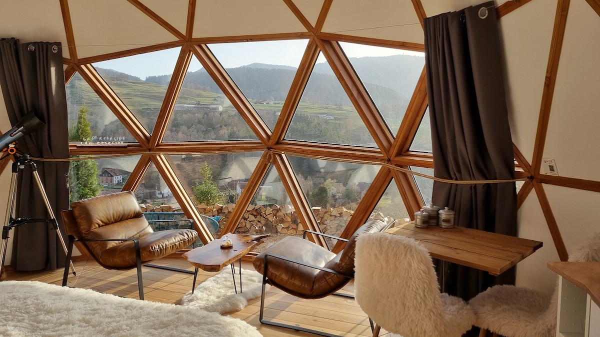 Apertura a marzo 2026 😊 Fuggi in coppia nella nostra cupola geodetica “Le Cocon”, situata di fronte alle montagne, e goditi una vacanza senza tempo. Le sue finestre triangolari lasciano entrare la luce e rivelano una rilassante vista panoramica, invitandoti a rallentare e a goderti il momento presente. Progettata per una fuga romantica, questa cupola è un rifugio accogliente e intimo in cui ogni dettaglio è stato curato con attenzione per creare un’atmosfera rilassante e tranquilla.