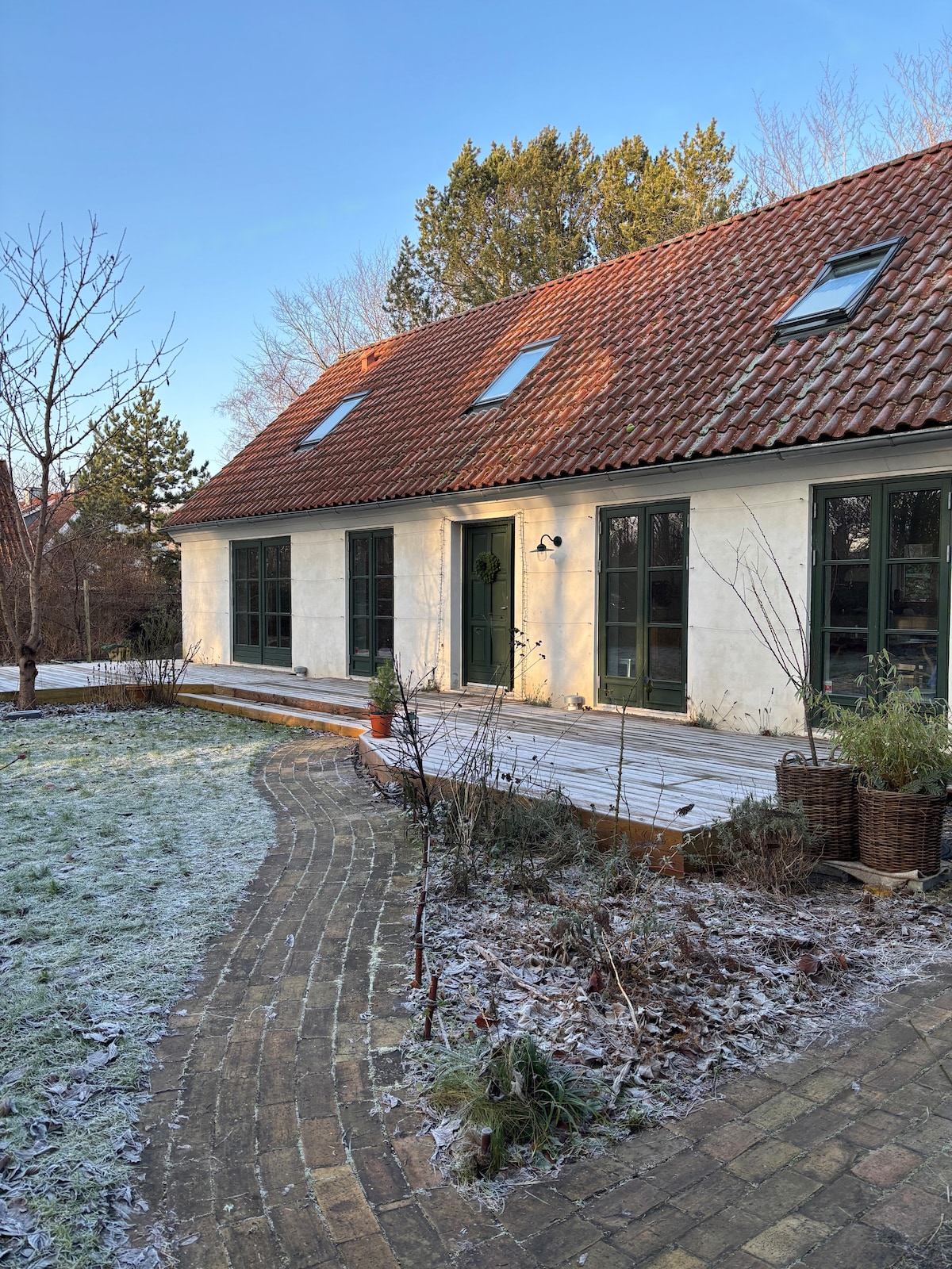 Located only 10 minutes walk from the sea, next to woods, close to Louisana and only a 30 minutes away in train from Copenhagen, this house is a perfect spot for relaxing and exploring. Besides great and friendly neighbours and a cosy hood, you will have access to playgrounds can cosy fire places. The house (from 2007), designed by renowned artitects, has its own small private gardens (front and back), is equipped with everything a family needs.