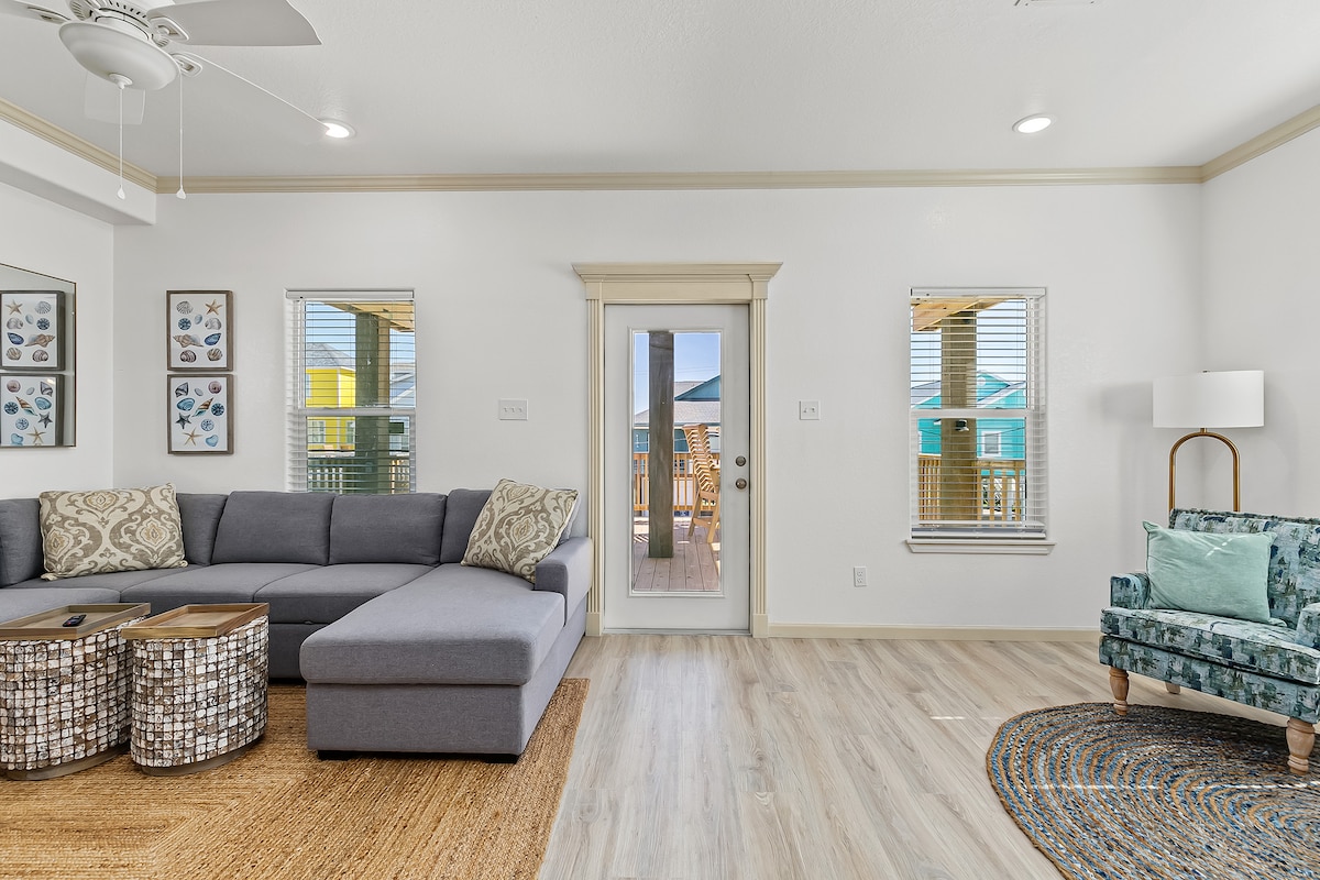 Casa Courageous si trova in un tranquillo quartiere sulla spiaggia, nel West End di Galveston. C'è accesso diretto alla spiaggia, a 1 minuto a piedi dal ponte pedonale che porta all'acqua. La spiaggia è chiusa ai veicoli, offrendo un ambiente sicuro e tranquillo da esplorare per il tuo gruppo. Questa casa ristrutturata è stata trasformata in una moderna oasi fronte mare che gli amanti del design apprezzeranno, con balconi avvolgenti che offrono una vista incontrastata sull'oceano da entrambi i lati della casa.