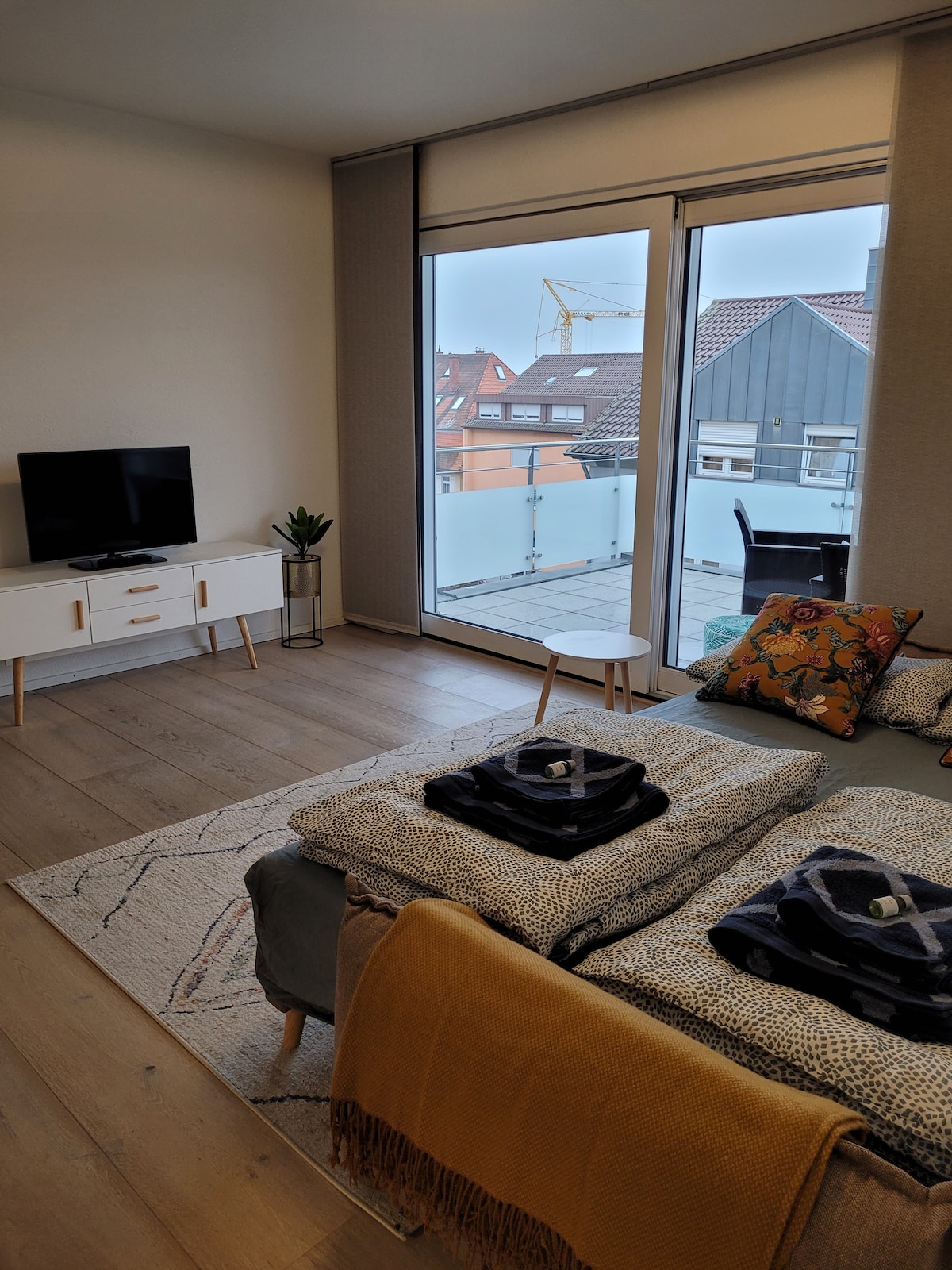 Il nostro moderno appartamento è luminoso e accogliente grazie all'ampia zona giorno e pranzo con la grande vetrata. Che si tratti di caffè al mattino o di vino la sera, il balcone invita a soffermarsi. In caso di maltempo, potete mettervi comodi sul divano e guardare la TV. È disponibile anche una chiavetta Amazon Fire TV, in modo da poter accedere anche ai vostri servizi di streaming. La cucina è completamente attrezzata.