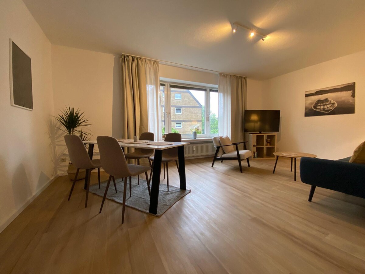 L'appartamento è situato nel centro di Wilhelmshaven, quindi attrazioni, ristoranti e la stazione centrale con annesso centro commerciale sono raggiungibili a piedi. L'arredamento è elegante e moderno e offre un soggiorno eccezionale grazie alla zona giorno e cucina a vista. Si trova al 2° piano, motivo per cui è bello e luminoso. Non c'è ascensore in casa, ma un parcheggio privato proprio davanti alla porta di ingresso.