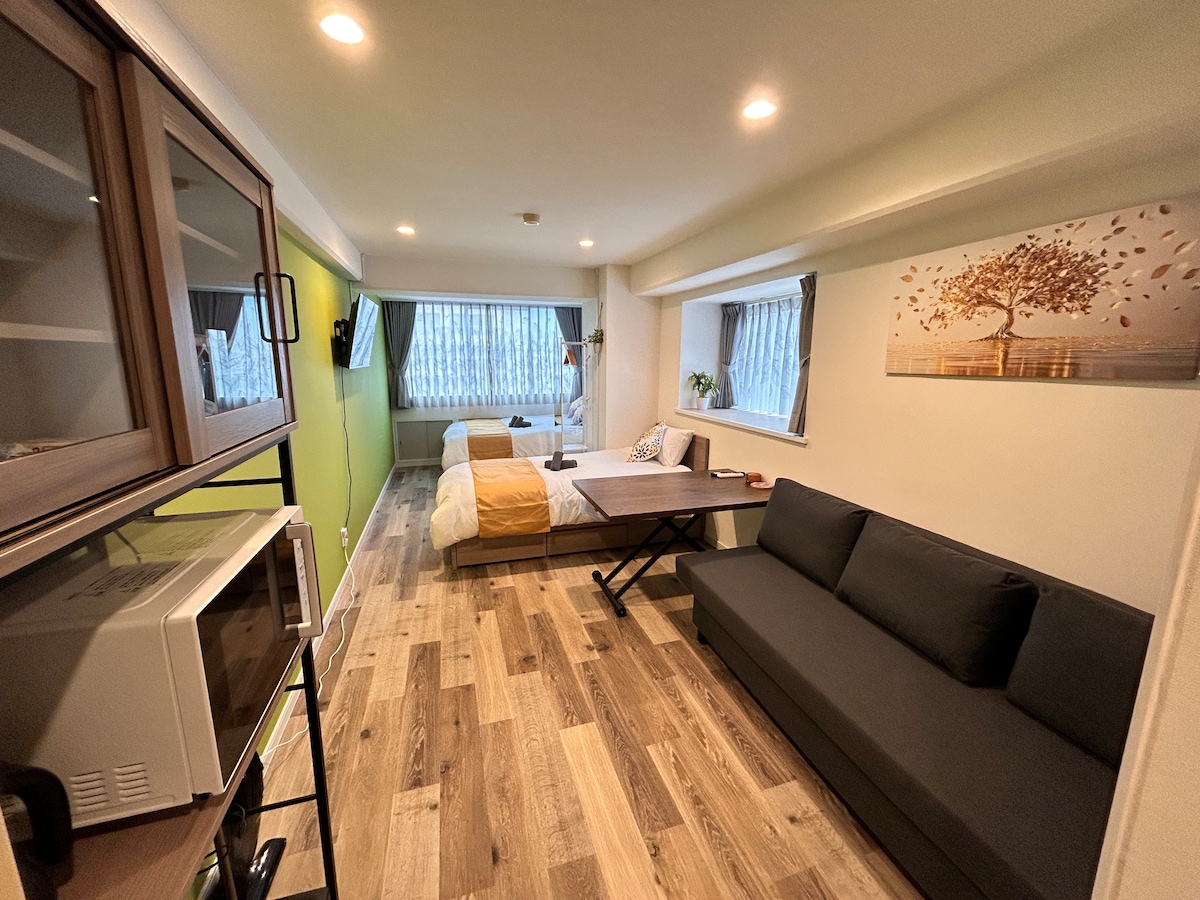 Ciao, sono Micky😄 Questo appartamento si trova a 10 minuti a piedi dalla stazione di Kawaguchiko. La vista del Monte Fuji dal secondo piano dell'appartamento è molto bella ed è un ottimo posto per scattare foto☺️ Il minimarket è a 3 minuti a piedi. Anche il parco divertimenti Fuji-Q Highland si trova in un'ottima posizione, a una sola stazione di distanza. La stanza era la mia attenzione, e la stanza in stile giapponese aveva una carta da parati con motivi di fiori di ciliegio fino al soffitto.Inoltre, la carta da parati dorata brilla sul tradizionale motivo giapponese e anche la luce è molto bella.Ci sono anche decorazioni come sedie e bonsai che utilizzano tappetini in tatami, così potrai goderti appieno lo spazio giapponese [giapponese]. La camera può ospitare fino a 4 persone. Abbiamo anche piatti e cuscini per bambini. Il letto è di dimensioni molto grandi di 2 metri (2 persone), e si può dormire con un futon su un tappetino tatami (1 persona).Un divano ancora più elegante può essere trasformato in un letto. Goditi appieno gli interni pieni del fascino del Giappone e del Monte Fuji, che vanta il Giappone! Grazie a te. * Dopo la prenotazione, ti mostreremo il bagno privato con doccia.Devi anche andare nel bagno con doccia una volta fuori dalla stanza e spostarti nella stanza successiva.Attraversa un piccolo corridoio condiviso, ma puoi stare certo che incontri raramente altri ospiti