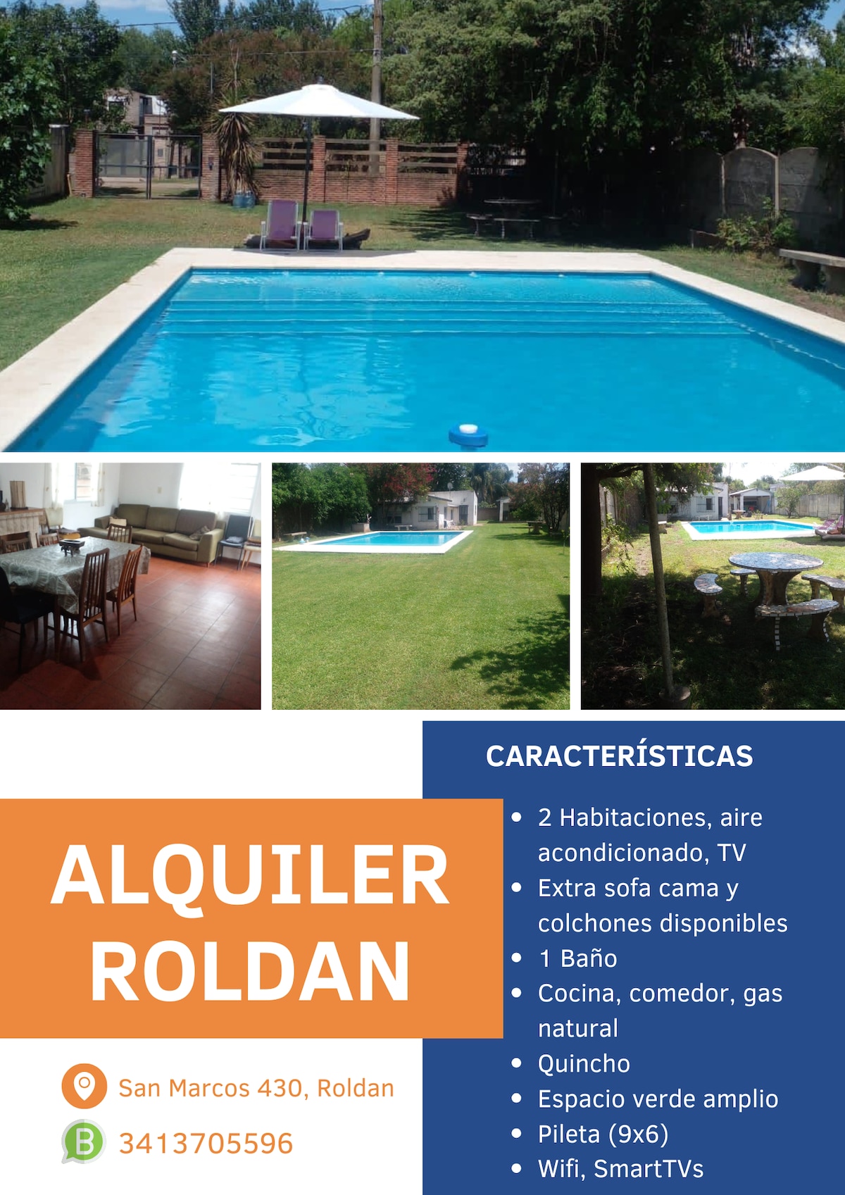 En barrio las tardes de Roldan con buenos accesos , plazas y espacios verdes. Casa quinta nueva, de 3 años, con amplio estar comedor, SMART TV, hogar a leña, sillones y barra, mesa y sillas para 6 personas, AA split y ventilador de techo en dormitorio, ventiladores portátiles, cocina completa, galería para disfrutar comidas al exterior, parrillero cubierto con implementos. Piscina con iluminacion , filtro aut. reposeras y tumbona El parque esta cercado, con plantas, flores Alarma.