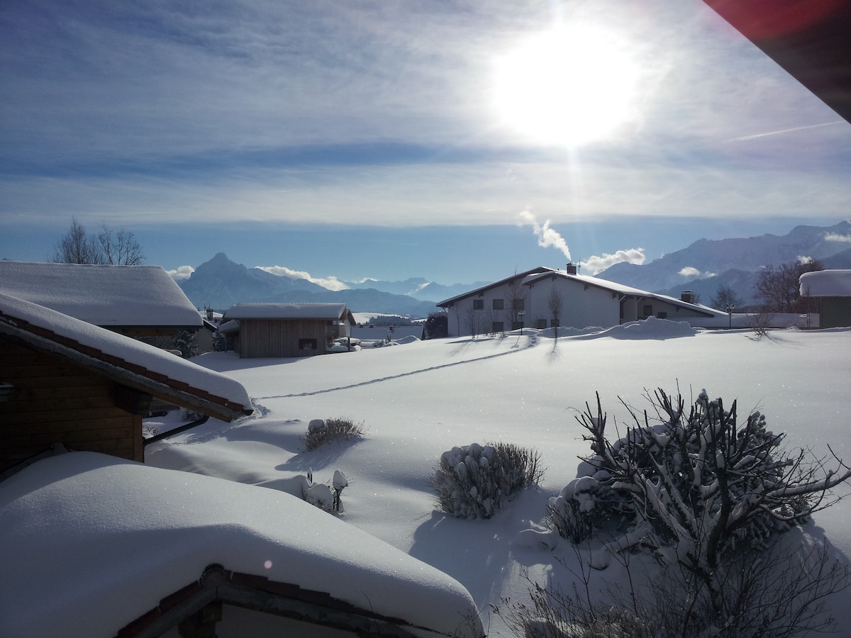 As soon as you arrive here, you’ll feel immediately relaxed. The air is fresh, the street is quiet and there’s a large green meadow next to the house with cows in summer. You have a breathtaking view on the Alps. The flat is located on the second floor where you can enjoy this view perfectly from our balcony. The flat is fully equipped with a large living- and dining room with fireplace, a kitchen, a bedroom and a bathroom.