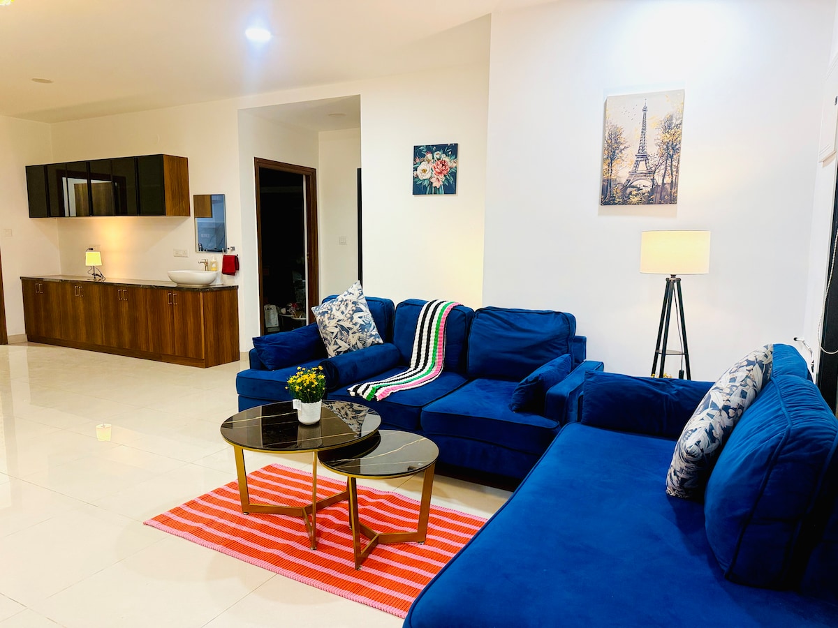 Se ti annoi e cerchi un cambiamento, dimentica le tue preoccupazioni in questo spazio spazioso e sereno,con un soggiorno tranquillo. SERVIZI: 1. meravigliosa vasca da bagno con vasca idromassaggio Jacuzzi 2. Goditi il bagno turco al giaguaro. 3. Sala del teatro ben riservata con bellissimo tetto con vista sul cielo, i migliori divani reclinabili. 4. Ampio balcone aperto con erba opaca verdeggiante. 5. Ampio parcheggio interno 2 auto. 6. Serratura intelligente per la porta principale. 7. Cucina completamente rifornita con utensili e pentole Se è necessario, è disponibile anche la cucina