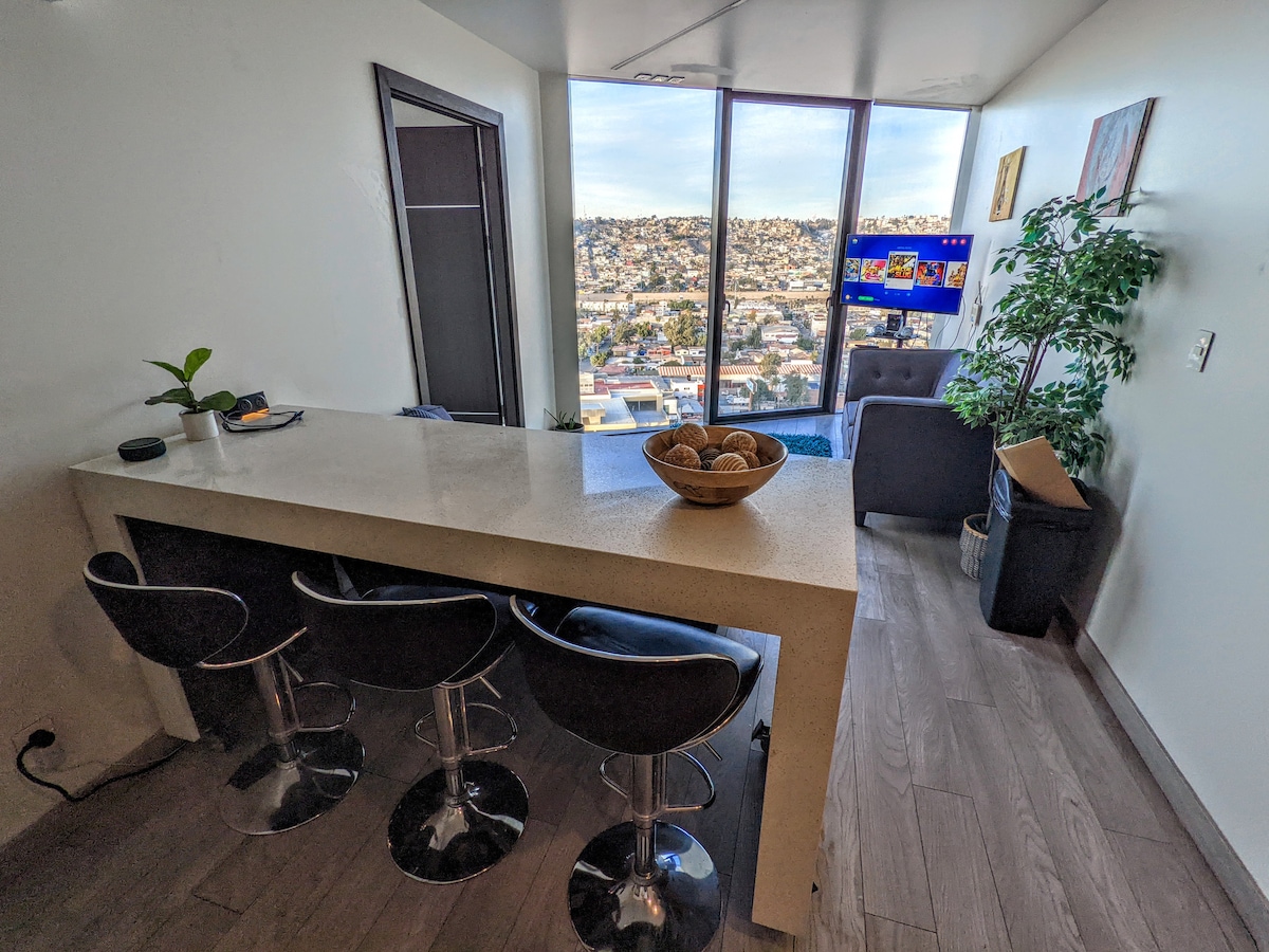 **Benvenuto nella tua oasi urbana a Tijuana!** Fuggi nel nostro lussuoso appartamento con 2 camere da letto, perfettamente situato nel cuore del quartiere più sicuro e ricercato di Tijuana, con sicurezza 24 ore su 24 e accesso controllato. Prova l'epitome della vita urbana con tutti i comfort di una casa. Rimani attivo ed energico nella palestra, completa di uno studio di yoga, e non dimenticare di visitare il salotto sul tetto, dove potrai sorseggiare un bicchiere di vino ammirando panorami mozzafiato della città
