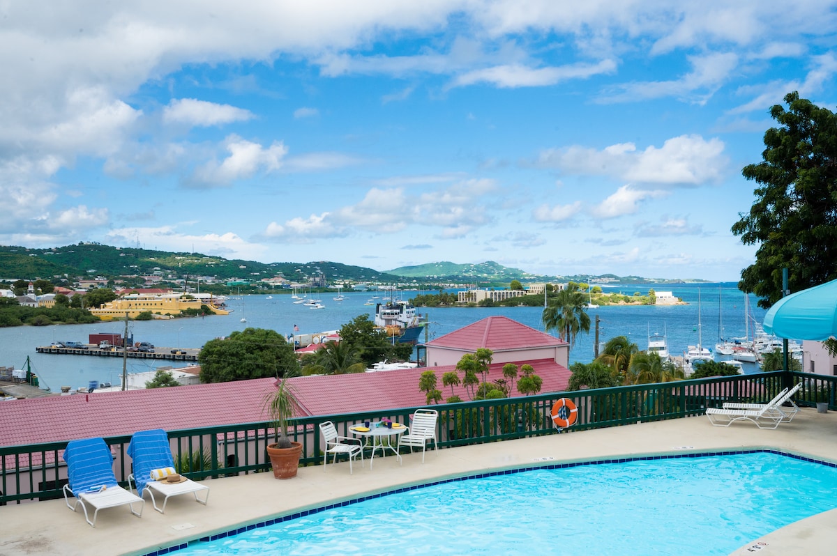 Fantastic, recently renovated luxury pool side apartment overlooking the Christiansted harbor and Buck island. This is an exclusive gated private residence nestled on Princesse Hill Estate, 2 miles from Christiansted town and 5 mins to local grocery stores, exclusive restaurants, and local beaches. Open your curtains and enjoy the breath taking views of the old Danish City, Buck island, and Green Key. Just want to relax? Enjoy direct access to the pool and hot tub steps away from your door.