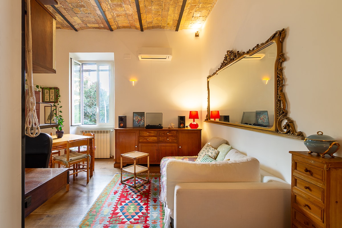 Appartamento di design situato al 3 piano di un palazzo storico a Trastevere. L'appartamento è dotato di 1 camera da letto, 1 bagno con doccia walk-in, ampio salone e cucina a isola equipaggiata con forno e lavastoviglie. Affaccia sul Tevere con vista Vittoriano. Molto ben collegato con tutta la Città risulta ideale per visitare le limitrofe Piazza Venezia, Colosseo, Fori Romani, Isola Tiberina, Bocca della Verità, Campidoglio, Ghetto Ebraico e per godersi il caratteristico quartiere romano.