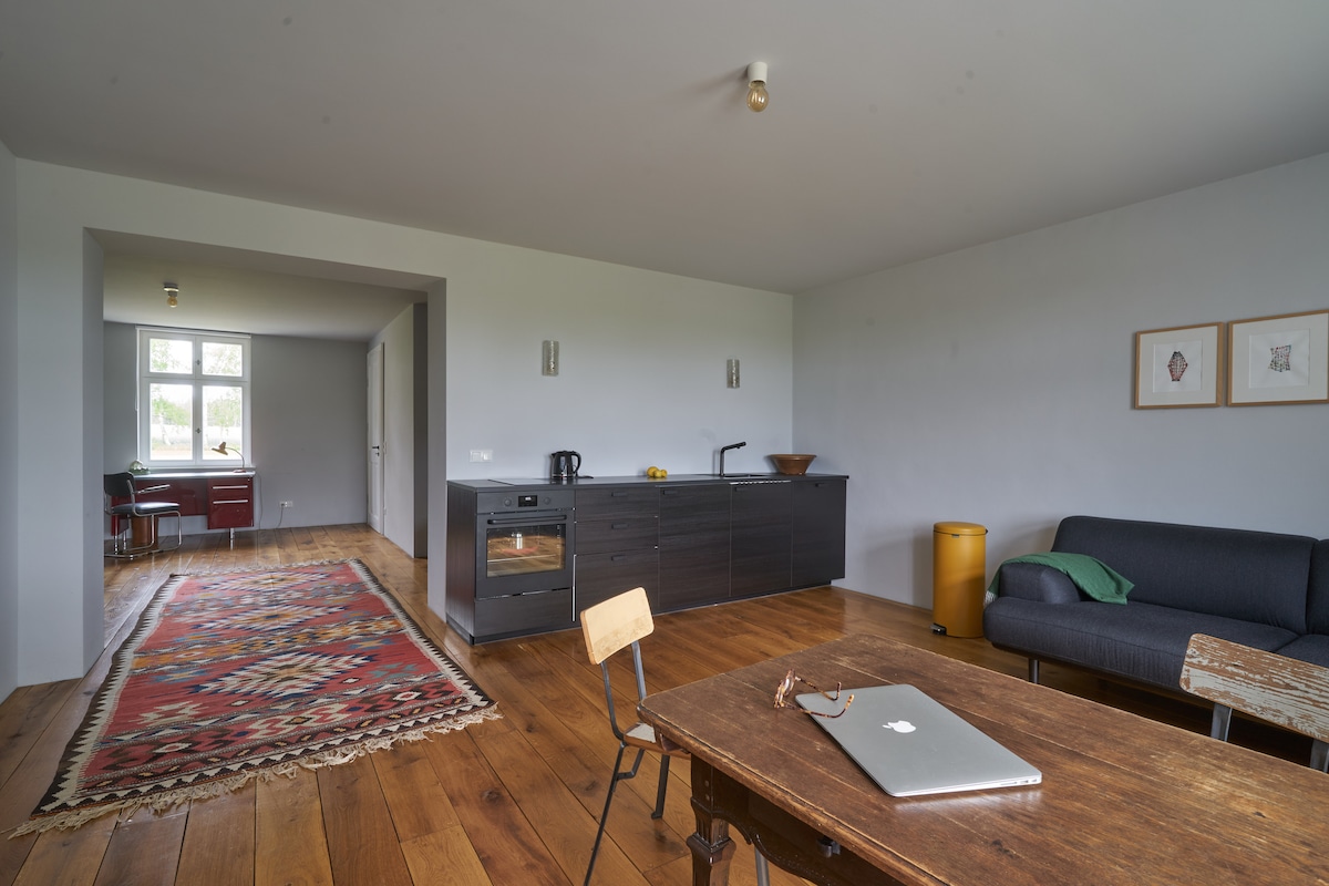 Il nostro piccolo appartamento di 56mq, ristrutturato con cura, fa parte della nostra vecchia casa in mattoni (ex panetteria) situata in un angolo bello e ricco di natura dell'Uckermark. È un punto di partenza ideale per piccole gite di un giorno - nelle immediate vicinanze ci sono diversi laghi balneabili, piste ciclabili ed escursionistiche, vecchi borghi e tante altre offerte turistiche. Nel nostro villaggio di Flieth c'è un piccolo negozio regionale con prodotti biologici da agricoltori locali e un bel pub con birreria all'aperto.