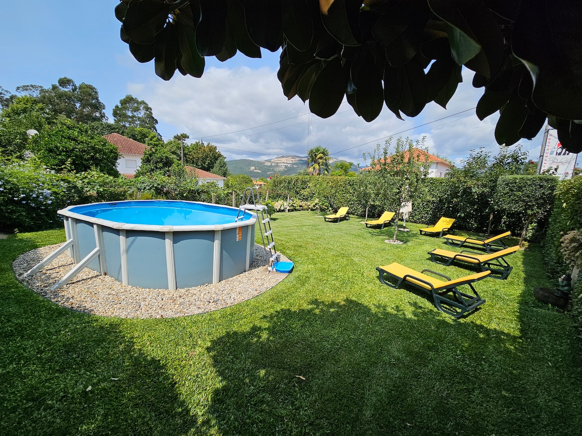 Appartamento al piano terra di una villa, con 3 camere da letto, con accesso esclusivo alla piscina e al giardino, barbecue e tavolo di supporto. (niente è condiviso) L'accesso all'appartamento è autonomo dal resto della casa Situato nel villaggio chiamato Brandara nel comune di Ponte de Lima. Accesso A3 a 3 minuti e accesso alla A27 a 3 minuti. Situato a 5 km da Ponte de Lima (7 minuti). Si trova a 40 minuti dal Parco Nazionale di Peneda Gerês. 40 minuti dalla città di Braga e 20 minuti da Viana do Castelo.