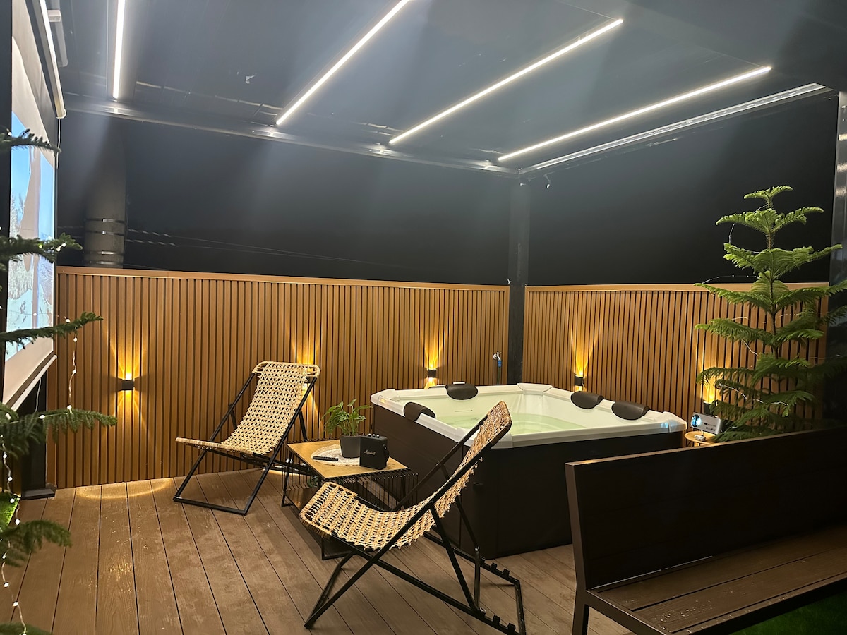 Ti diamo il benvenuto al The Penthouse Nuvali, il tuo rifugio ideale! Questo accogliente rifugio in stile loft offre tutto il necessario per il relax e l'intrattenimento: • Vasca idromassaggio privata per rilassarsi sotto le stelle • Configurazione cinema all'aperto con proiettore per serate cinematografiche epiche • Cucina attrezzata per pasti fatti in casa • Banco da bar • WiFi ad alta velocità, TV e ampio design moderno con lussureggianti accenti in erba artificiale • Giochi: freccette, poker e scacchi • Tagaytay a 30 minuti • 20 minuti per Enchanted Kingdom