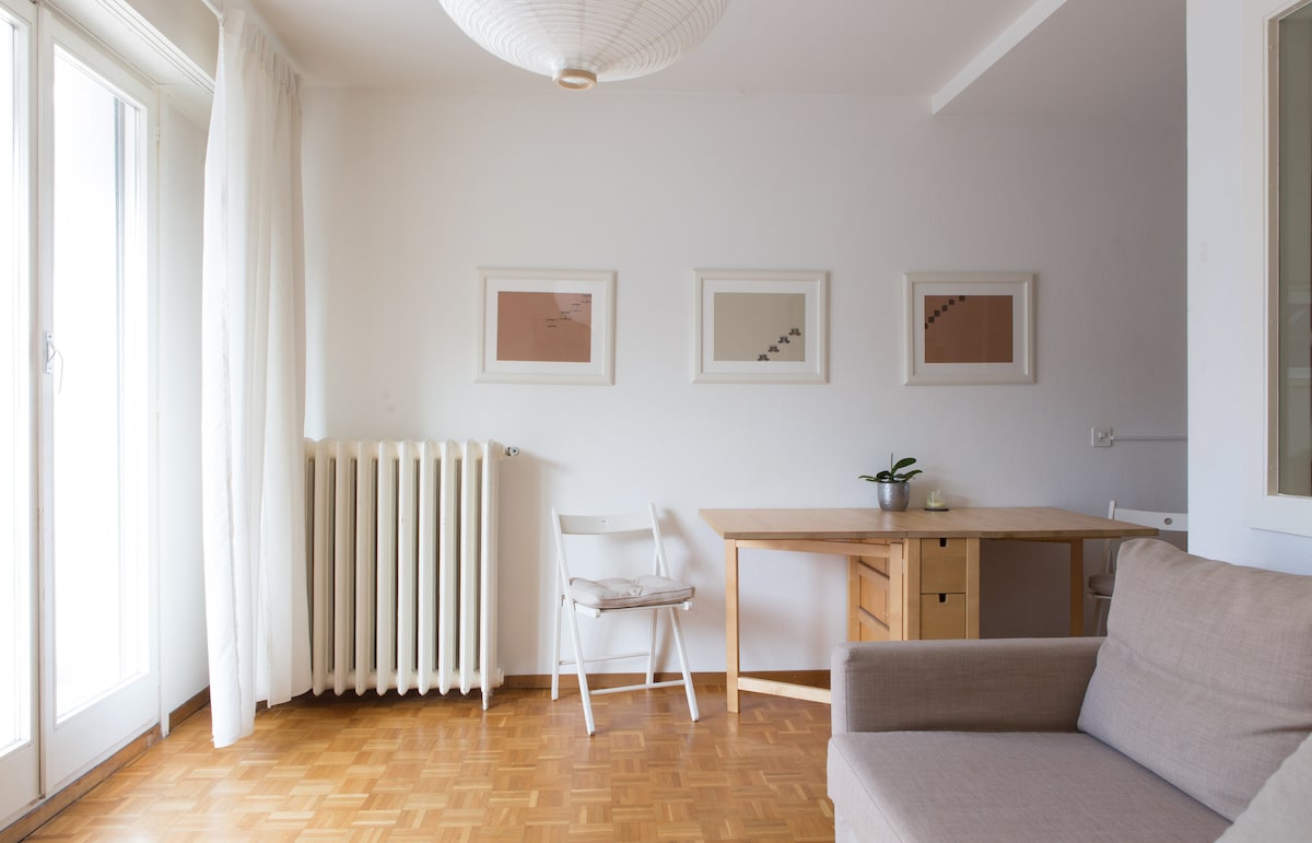 Bright and cozy studio in Geneva, 15 min from Lake Geneva & Jet d’Eau. Quiet area near Arve River & Carouge, close to cafés, restaurants, and supermarkets. Fully equipped kitchen with coffee, tea & chocolate. Perfect for couples, solo travelers, long stays or weekend getaways. Fast Wi-Fi, easy self check-in, fresh linens, and pets allowed (optional fee). Comfortable, bright, and ready for a relaxing stay.