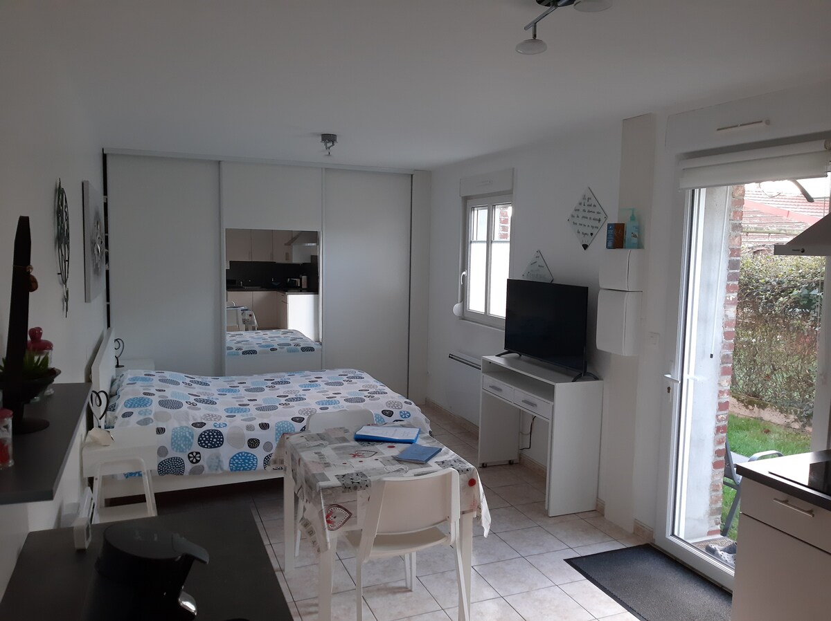 studio de 35m2,situé au fond de notre jardin où règne calme et détente (sans aucun vis à vis). Petit coin jardin. Le studio est moderne et chaleureux . Vous y trouverez une pièce principale avec coin cuisine, équipée d une cafetière, plaque à gaz, micro onde, frigo, d un coin bureau, d'un canapé. Un coin nuit avec un lit double Une salle de bain. Linge de maison à disposition.place parking à l extérieur. Les + A2 pas du centre ville d 'Amiens et d un centre commercial.