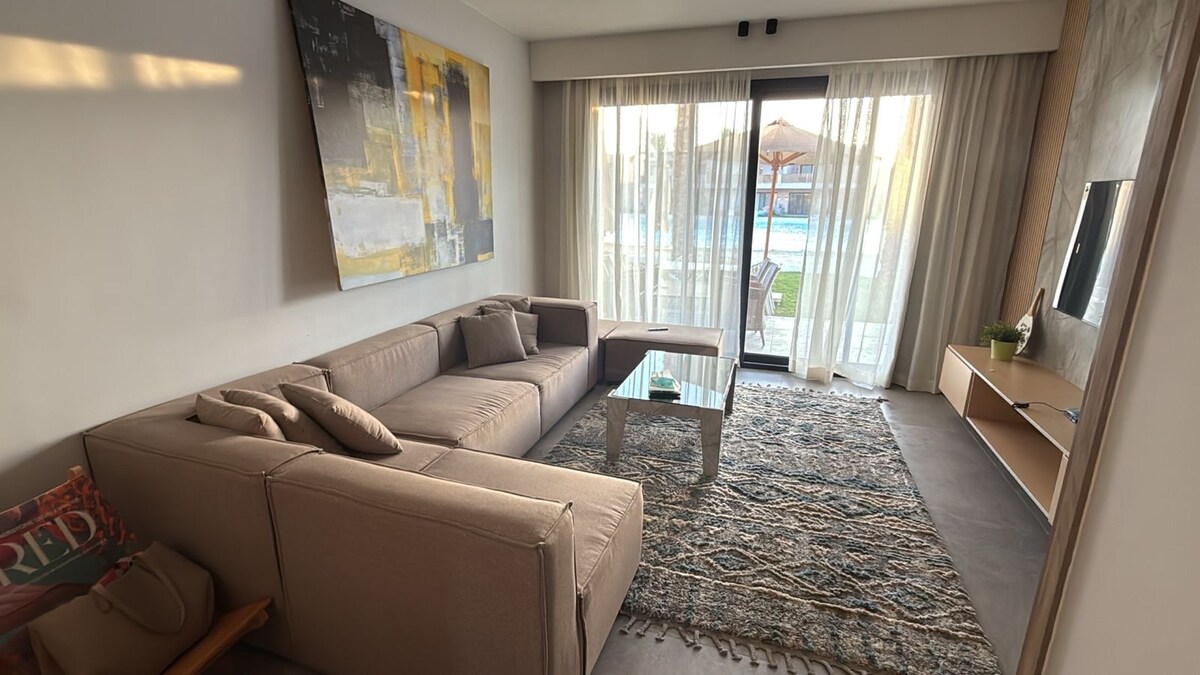 Brand-new, luxurious 4-bedroom chalet in the heart of Marina Resort. - Unparalleled panoramic views of the Rixos Hotel and New Alamein Towers. - Modern amenities: High-speed WiFi, Smart TV, coffee machine, and washer. - Fully equipped gourmet kitchen and stylish, high-end furnishings throughout. - Just an 8-minute walk to pristine, sandy beaches: Enjoy the soft sands and crystal-clear turquoise waters of the Mediterranean. - Prime location near restaurants, nightlife, and the aqua park.