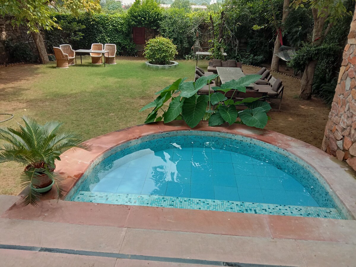 Rifugiati nell'Aanandam Retreat, un tranquillo cottage di lusso con 2 camere da letto ad Ajmer, con piscina privata, prato verde e terrazza sul tetto per ammirare l'alba e le stelle. Gli ospiti amano il mix di comfort e natura: camere accoglienti con servizi moderni, una cucina all'aperto per preparare piatti autentici ed esperienze come l'agricoltura biologica, le notti intorno al falò e le escursioni sul lago. Adatto agli animali domestici e immerso nel verde, è ideale per famiglie, coppie e gruppi che vogliono rilassarsi, riconnettersi e creare ricordi duraturi.