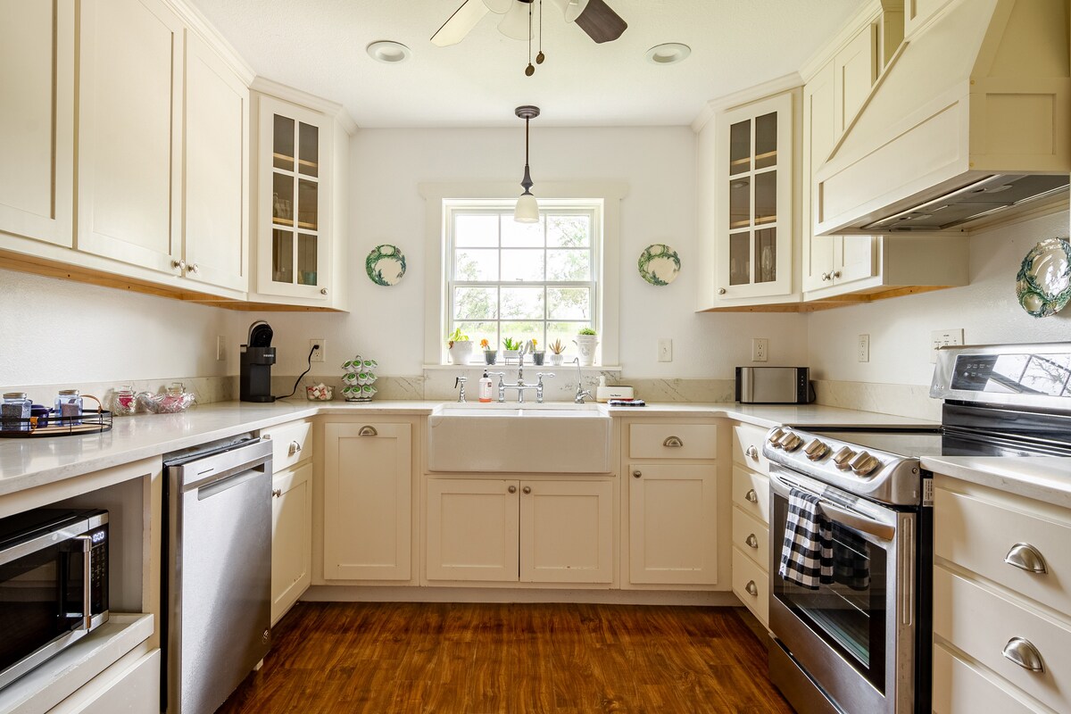 Benvenuto alla Farmhaus di Sophie!! Questo casale completamente ristrutturato si trova proprio accanto alla Texas Wine Trail. Il fascino delle case è stato preservato, fornendo allo stesso tempo tutti i comfort moderni che gli ospiti si aspettano. La casa è situata a 5 minuti da Main Street Fredericksburg, per un facile accesso a negozi, musei, gallerie d'arte o per iniziare il tour delle cantine, con quella più vicina a meno di 2 km dalla casa. Rilassati sul portico o siediti intorno al focolare con un bicchiere di vino per concludere la giornata.