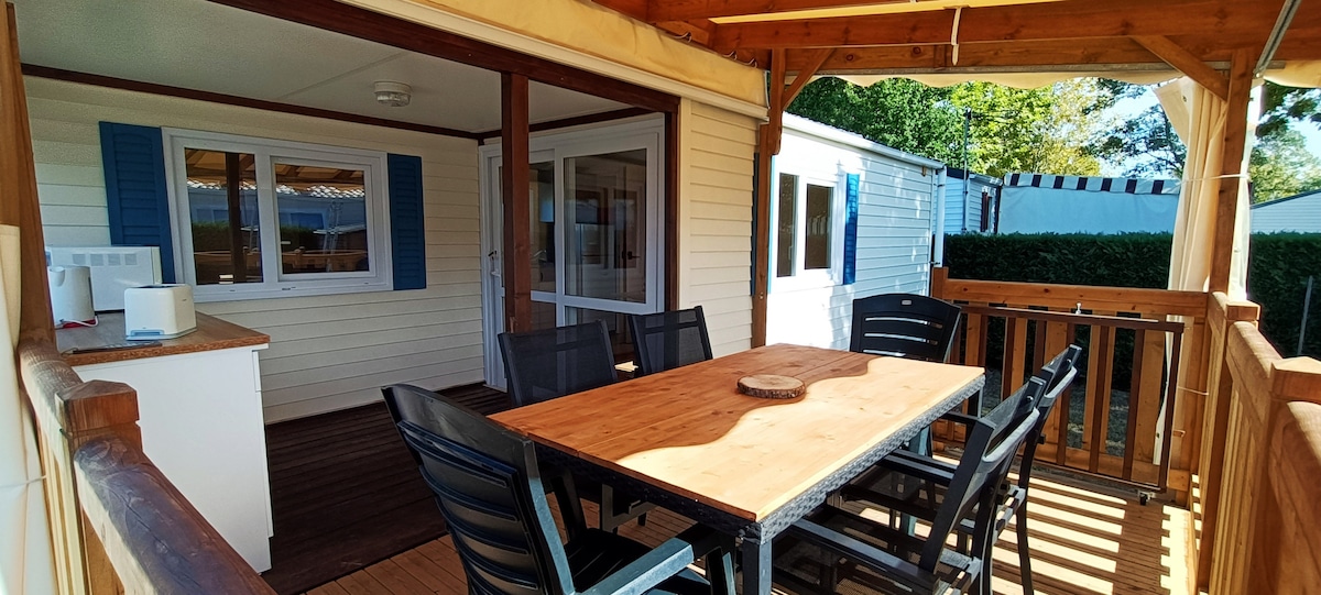 Venite a godere di questa casa mobile di lusso, da soli, in famiglia, con gli amici o con il vostro animale domestico. La casa mobile climatizzata dispone di 3 camere da letto e una cucina completamente attrezzata ( lavastoviglie, forno a microonde, forno, Airfryer, Senseo, utensili da cucina...) La camera da letto matrimoniale dispone di uno spogliatoio con lavatrice. 1 camera da letto con 1 letto a castello 1 camera con 1 letto singolo e 1 letto estraibile La terrazza di 18 mqcoperta è composta da un tavolo con 8 sedie e un salotto.