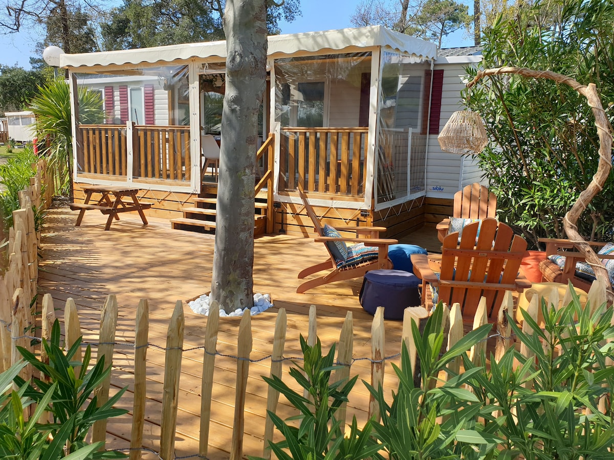 Al campeggio 4* Les Viviers, Mobil-home tranquillo con accesso al bacino di Arcachon. Alloggio luminoso, climatizzato. 2 ampie camere da letto (una matrimoniale con letto 140x190, TV e spogliatoio, e 1 con 2 letti 90x190), divano 🛋️ letto, bagno, WC separato. Ampia terrazza coperta e chiusa a metà stagione arredata con zona pranzo e zona soggiorno. Plancha, lettini e piccolo salotto da giardino sul terreno. 2 posti auto