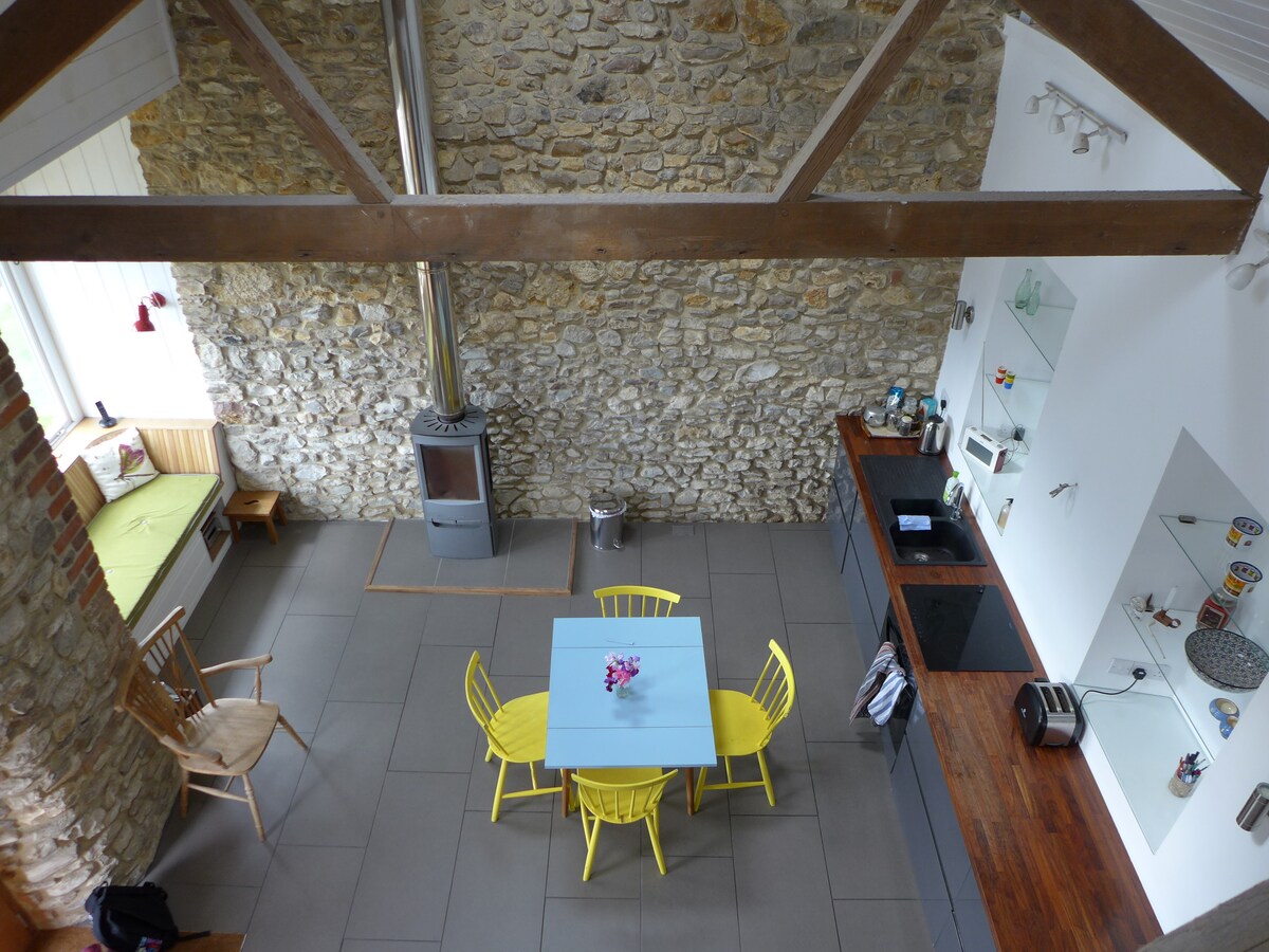 Fienile ristrutturato in 100 acri di terreno. Una casa piena di libri, giochi e giocattoli. Ospita facilmente almeno 10 persone comodamente. Il giardino, il laghetto, i boschi e le aree di parcheggio sono tutti a tua esclusiva disposizione durante il soggiorno. Viviamo lungo il vicolo dal fienile. Così avrete la vostra privacy. Nella fattoria abbiamo galline, anatre, pecore e maiali. A 5 minuti di auto dalla J28 della M5. A 20 minuti dal centro di Exeter. Non siamo vicino a spiagge belle, quindi non sceglierci per una vacanza al mare. Non è presente la spa o la vasca idromassaggio.