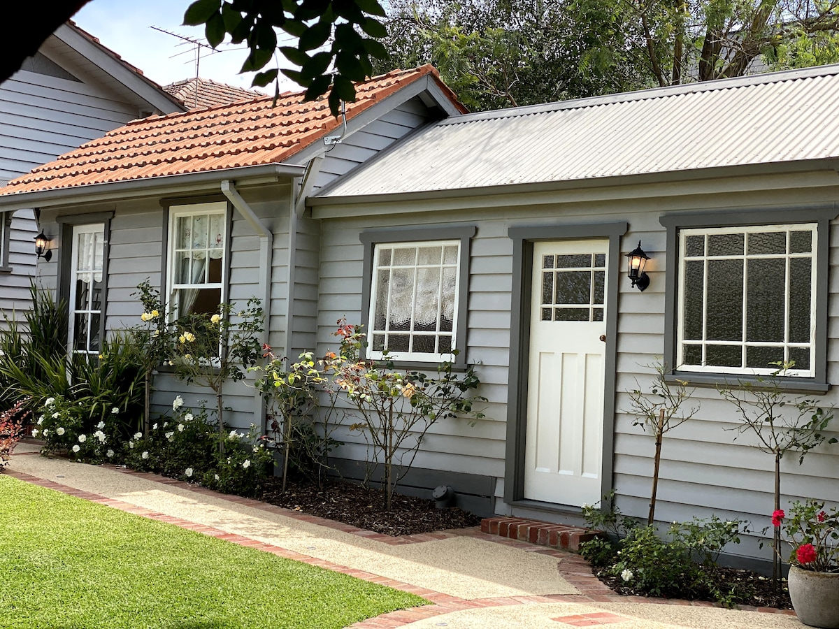 Stunning garden, peaceful,private compact Bungalow,at the rear of a 1926 California-style home. Private access. Bedroom/ensuite/kitchen/living with access outside dining area. Ideally suited to a single or couple who are in the area for work, major sporting event, or a family function. Few minutes walk to Tram/Bus into the heart of Melbourne. Close to cafes, restaurants, movie theatre, Balwyn Leisure centre and shopping village. Warm and welcoming Irish hosts who will respect your privacy..