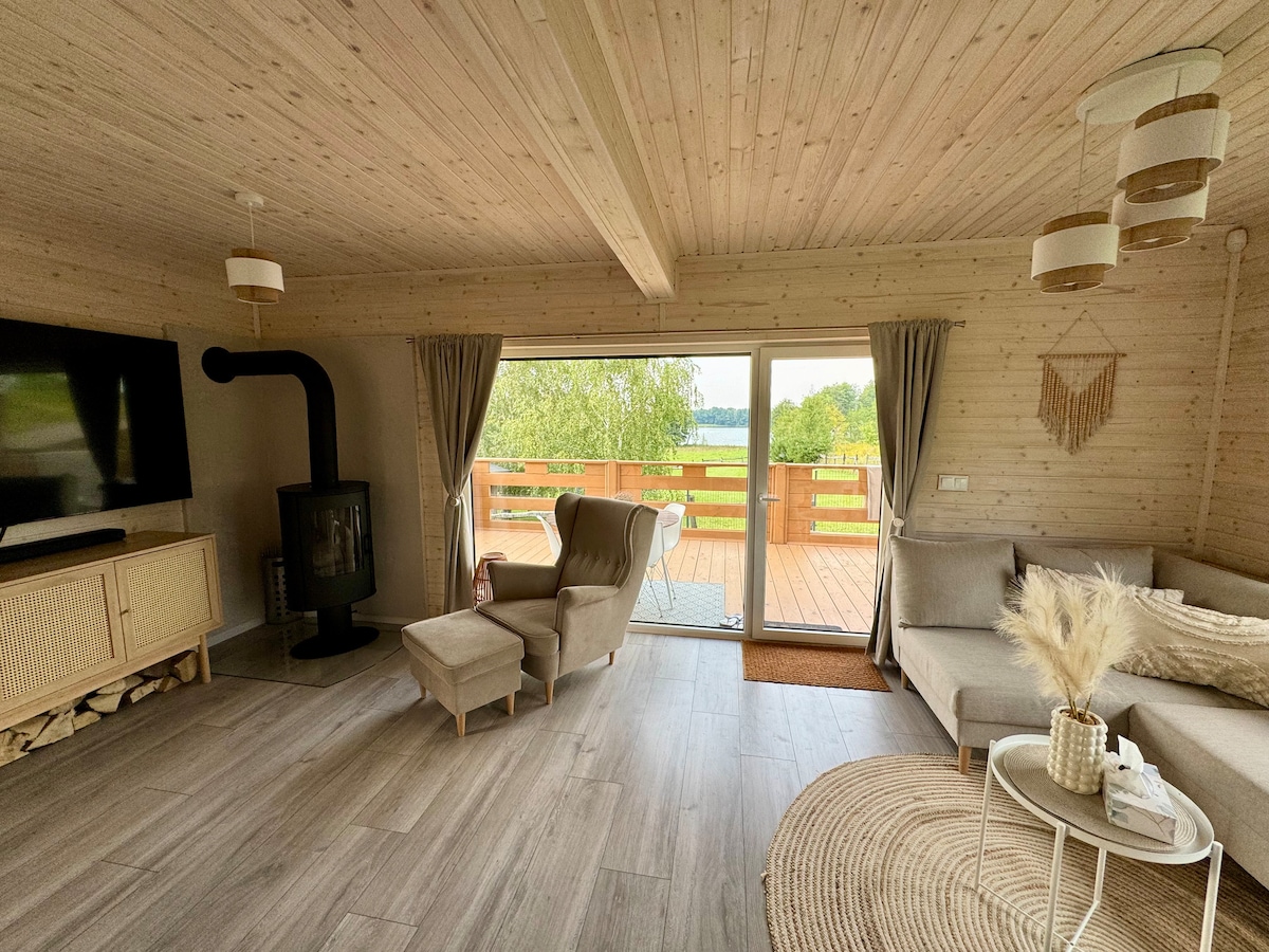Accogliente casa in legno con spiaggia privata, pontile, barca a remi e fantastica vista sul lago e sugli alberi circostanti. Rifinito con un alto standard, 2 bagni, 4 camere da letto, soggiorno con caminetto, cucina completamente attrezzata e ampia terrazza, il tutto progettato avendo in mente il comfort e la soddisfazione dei nostri ospiti. Sulla trama recintata intorno alla casa, a parte un falò con panchine fatte a mano e comode amache, è possibile trovare un sacco di spazio verde che consente tutti i tipi di ricreazione familiare e relax.